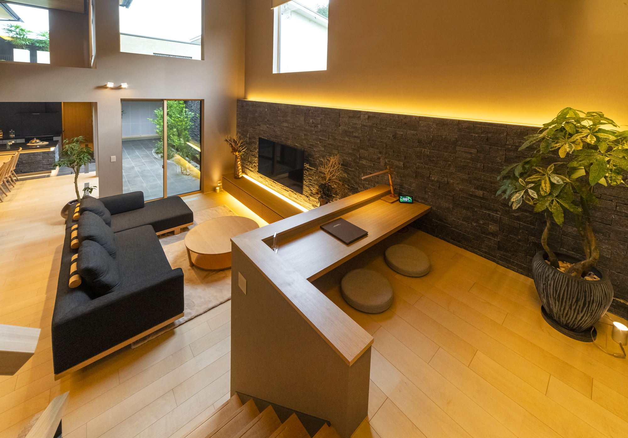 一部を下げ天井にしたり、吹き抜けと組み合わせることで、空間の抑揚が生まれ、ただの箱ではない“ドラマのある住まい”が完成します。高低差は、暮らしに奥行きを与えるだけでなく、空調効率や採光にも効果的に作用します。