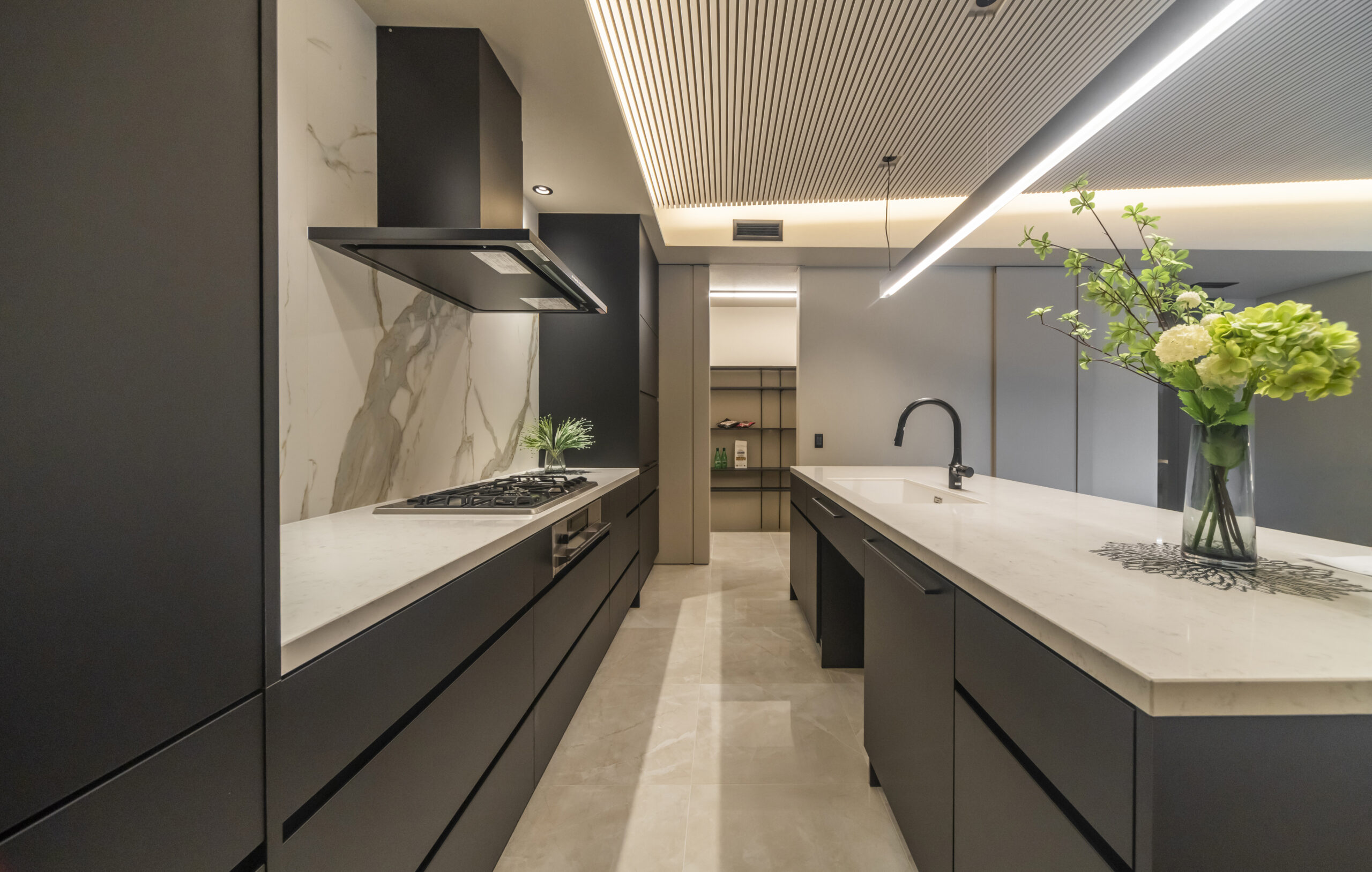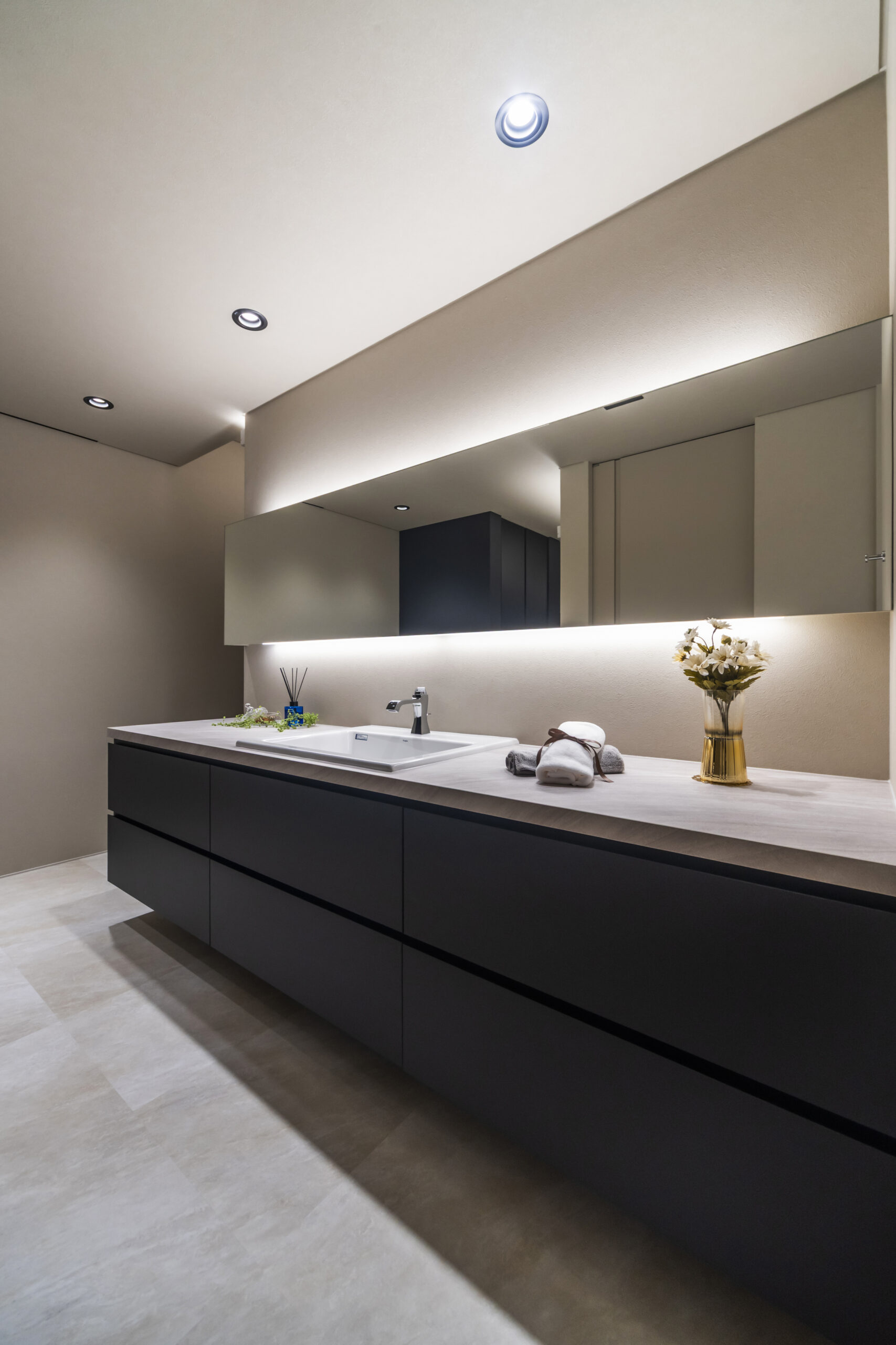 ルーバー天井からの間接照明が、大理石調の空間を優しく包み込む