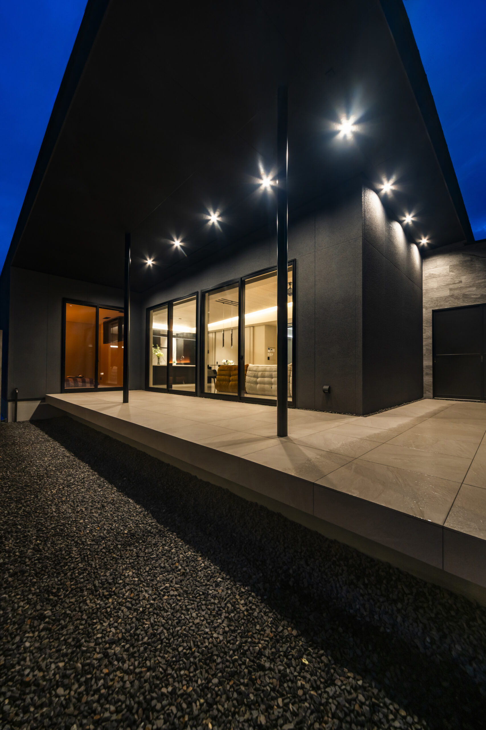 外部からの視線を遮るコンクリート塀が、プライベートな時間を守ります。夕暮れ時には計算されたライティングが建物を美しく浮かび上がらせ、帰宅する家族を優しく迎え入れます。