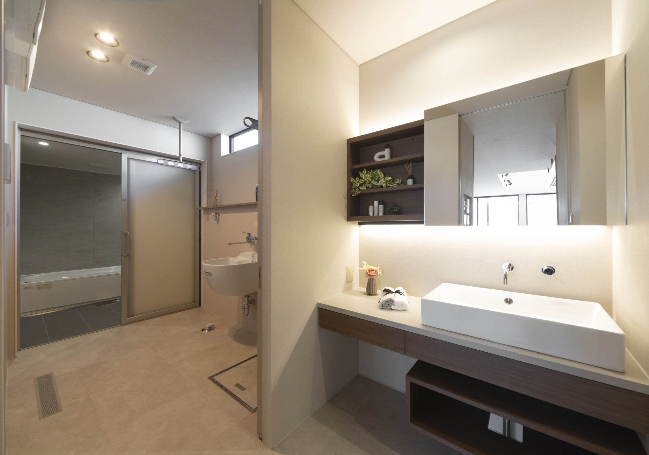 ワイドなミラーの上下に配した間接照明や、フロートタイプの洗面台が非日常感を高めます。
