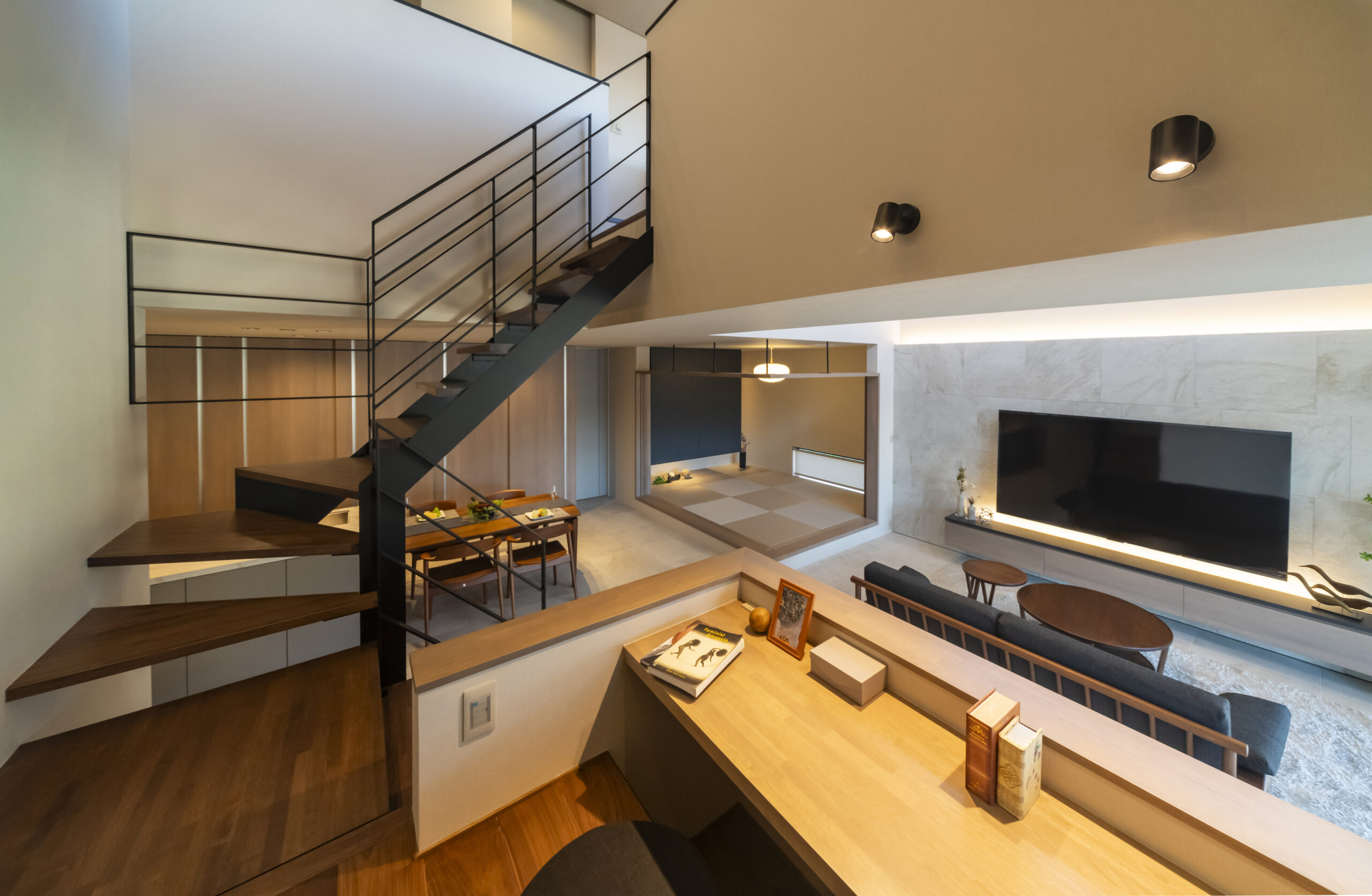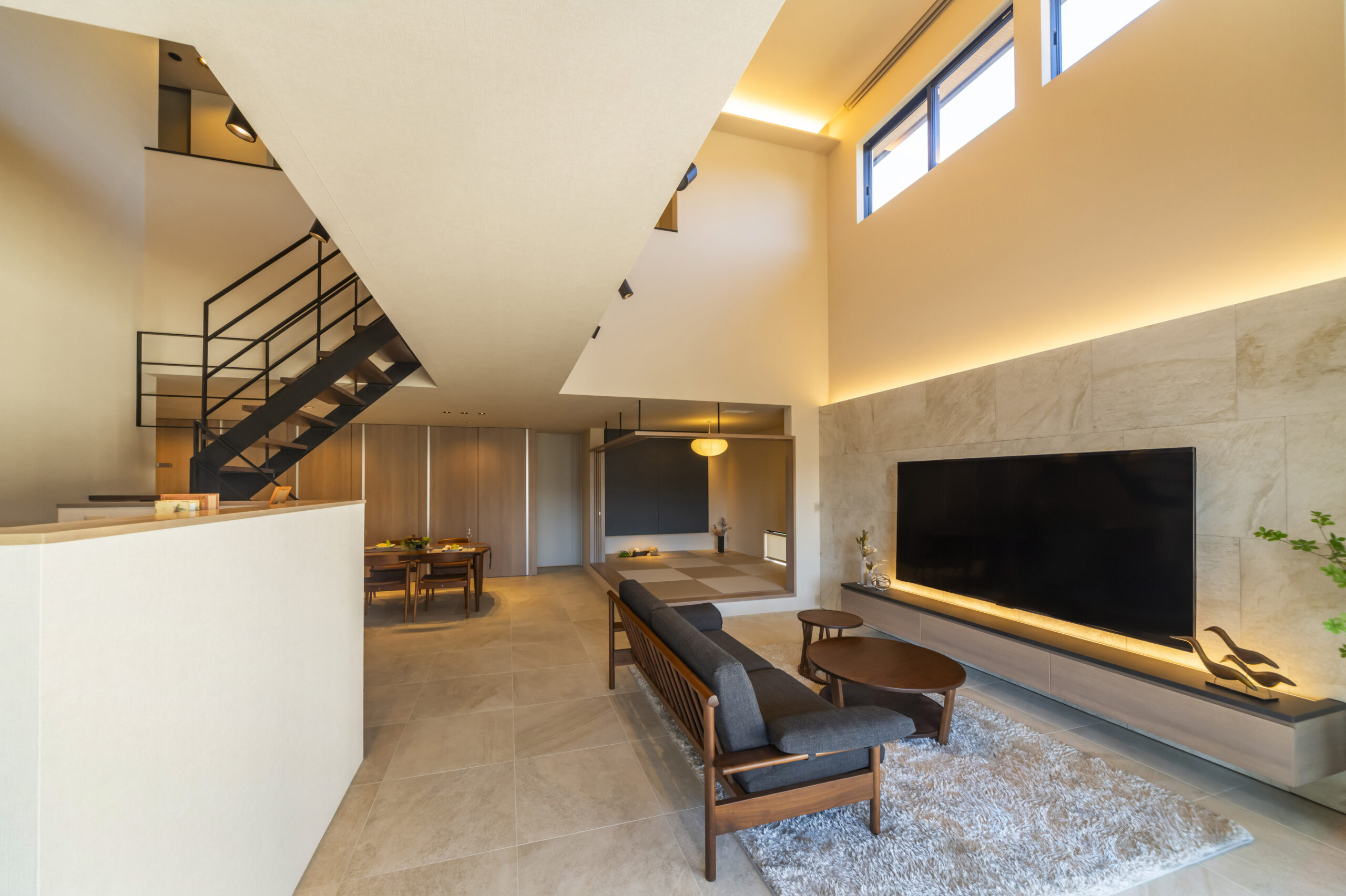 LDKダイナミックな吹き抜けとアイアンのスケルトン階段が、空間に圧倒的な開放感をもたらします。壁面にあしらった大判タイルと間接照明が、上質なリゾートのような寛ぎを演出。
