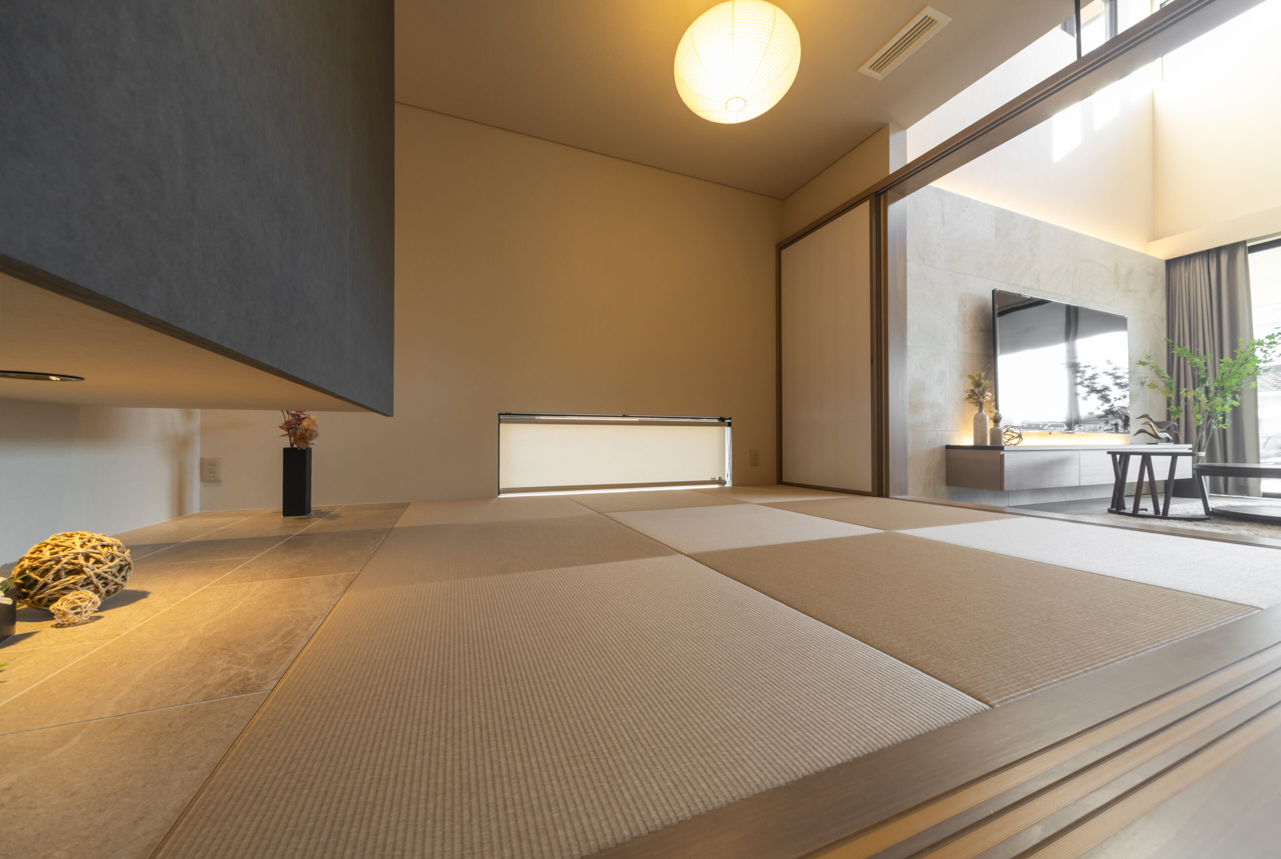 モダンな空間のトーンに馴染むよう、縁なし畳やシンプルな設えを採用。ちょっとしたお昼寝やゲストの宿泊スペースとしても重宝します。