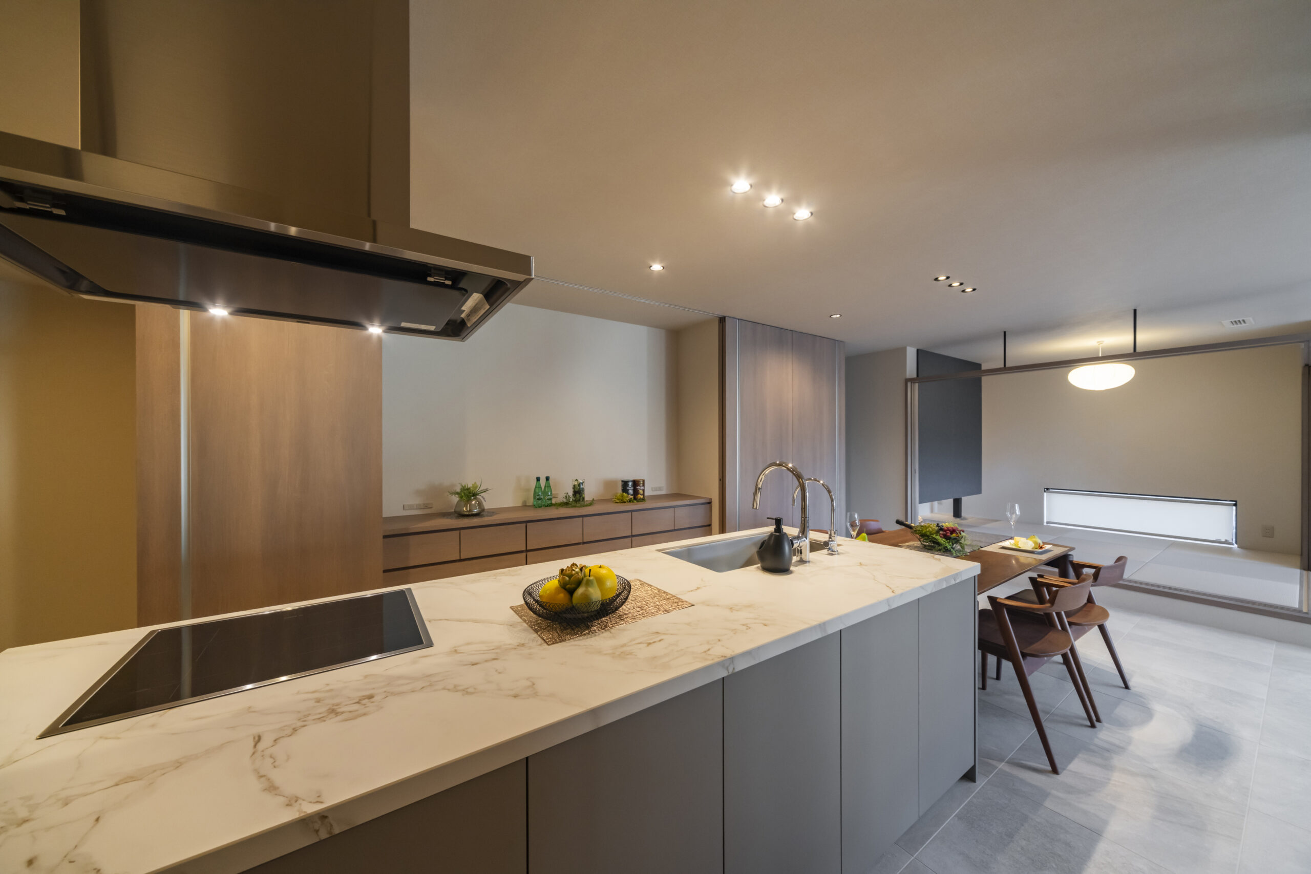 ダイニングテーブルを横並びに配置することで、配膳や片付けの動線が最短になり、毎日の家事負担を軽減します。洗練されたデザインは、空間の主役に。