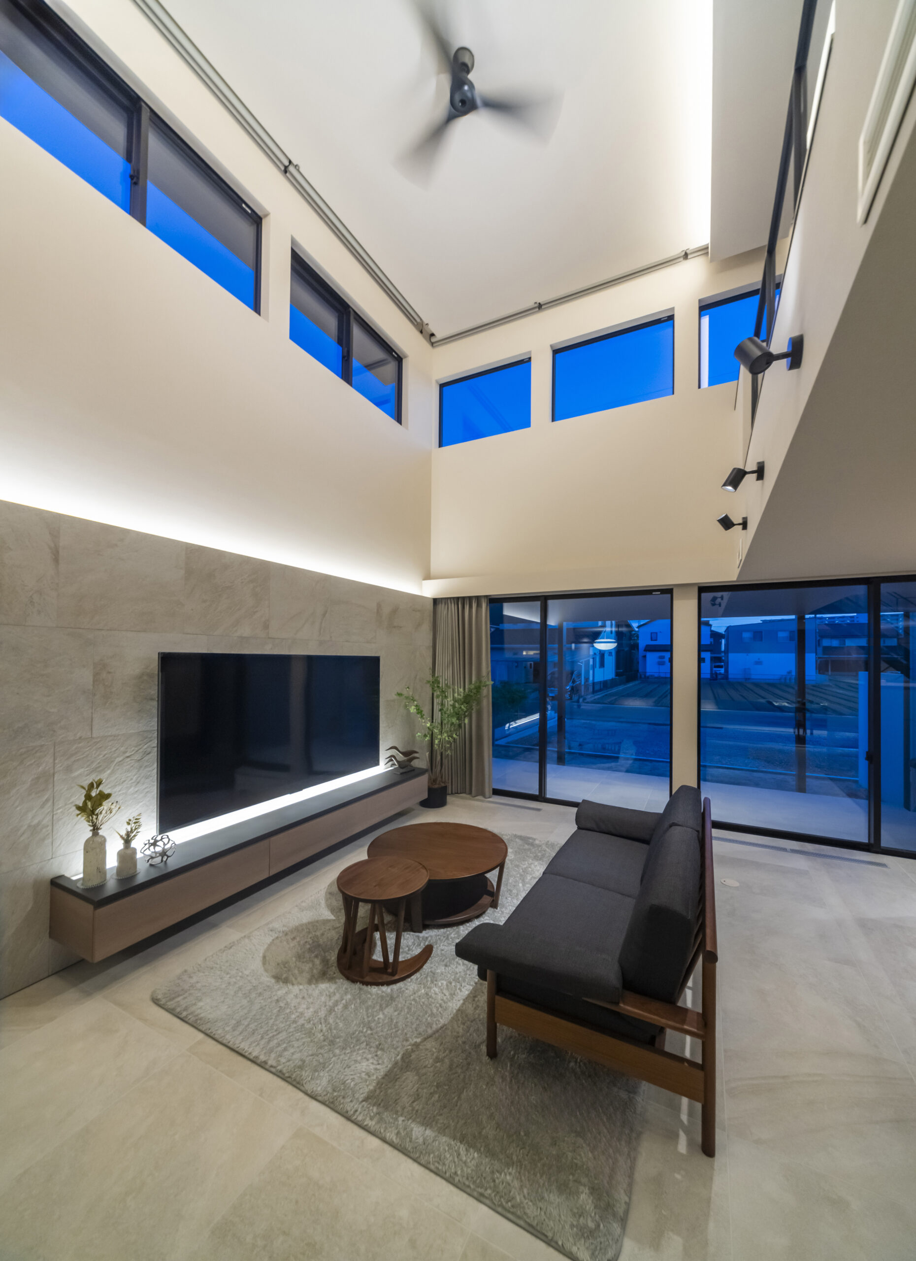 高窓から空の移ろいを取り入れつつ、夜はTVボード上部や折り上げ天井に仕込まれた間接照明が、昼間とは違うラグジュアリーで落ち着いた雰囲気を醸し出します。