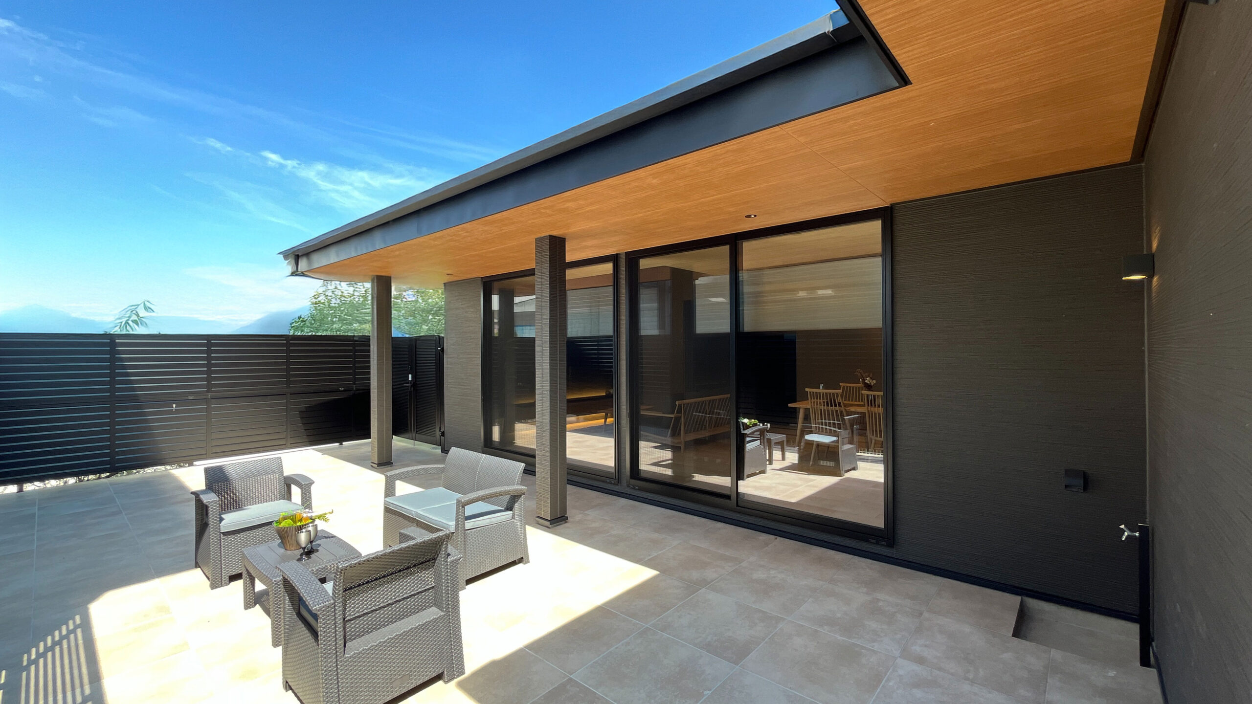 リビングからフラットに繋がるテラスは、平屋ならではの贅沢なアウトドアリビング。