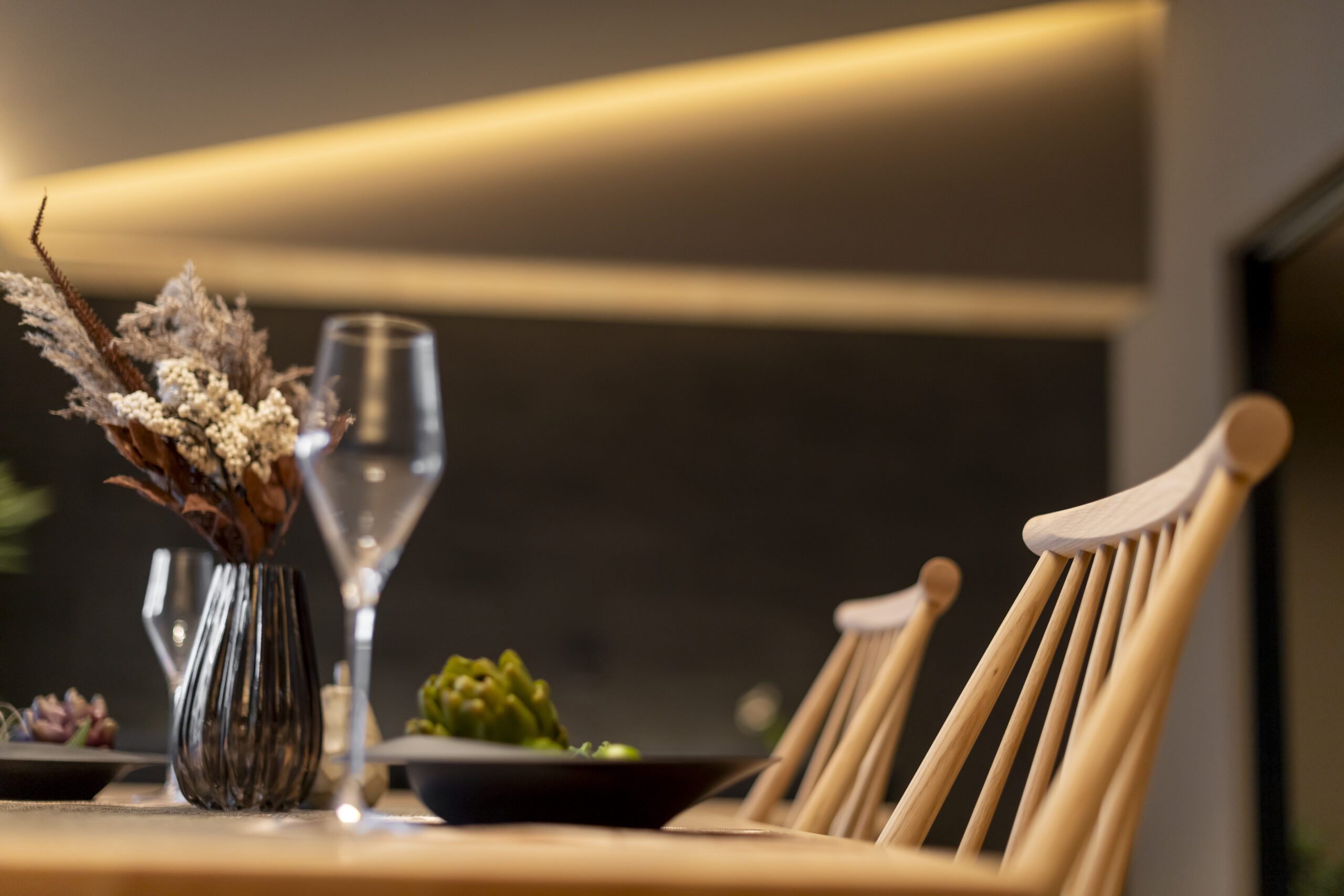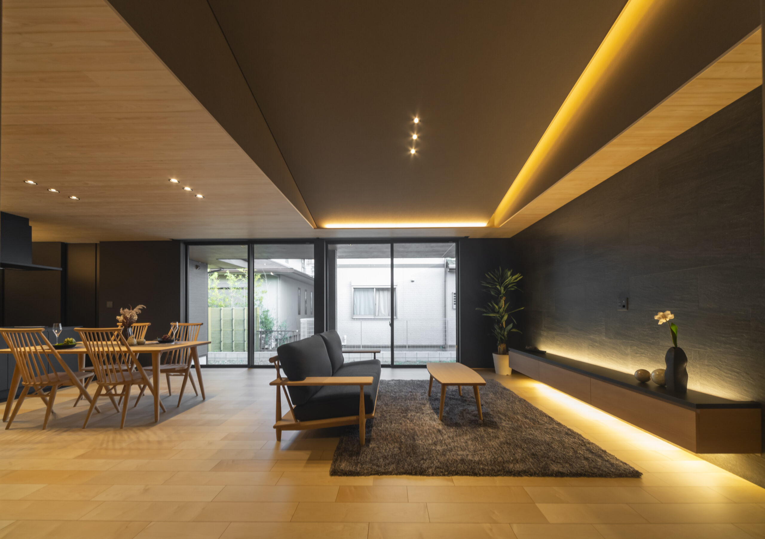 ダイナミックな勾配天井と間接照明が織りなす光のグラデーションが、まるで高級リゾートホテルのラウンジのような高揚感と安らぎをもたらします。
