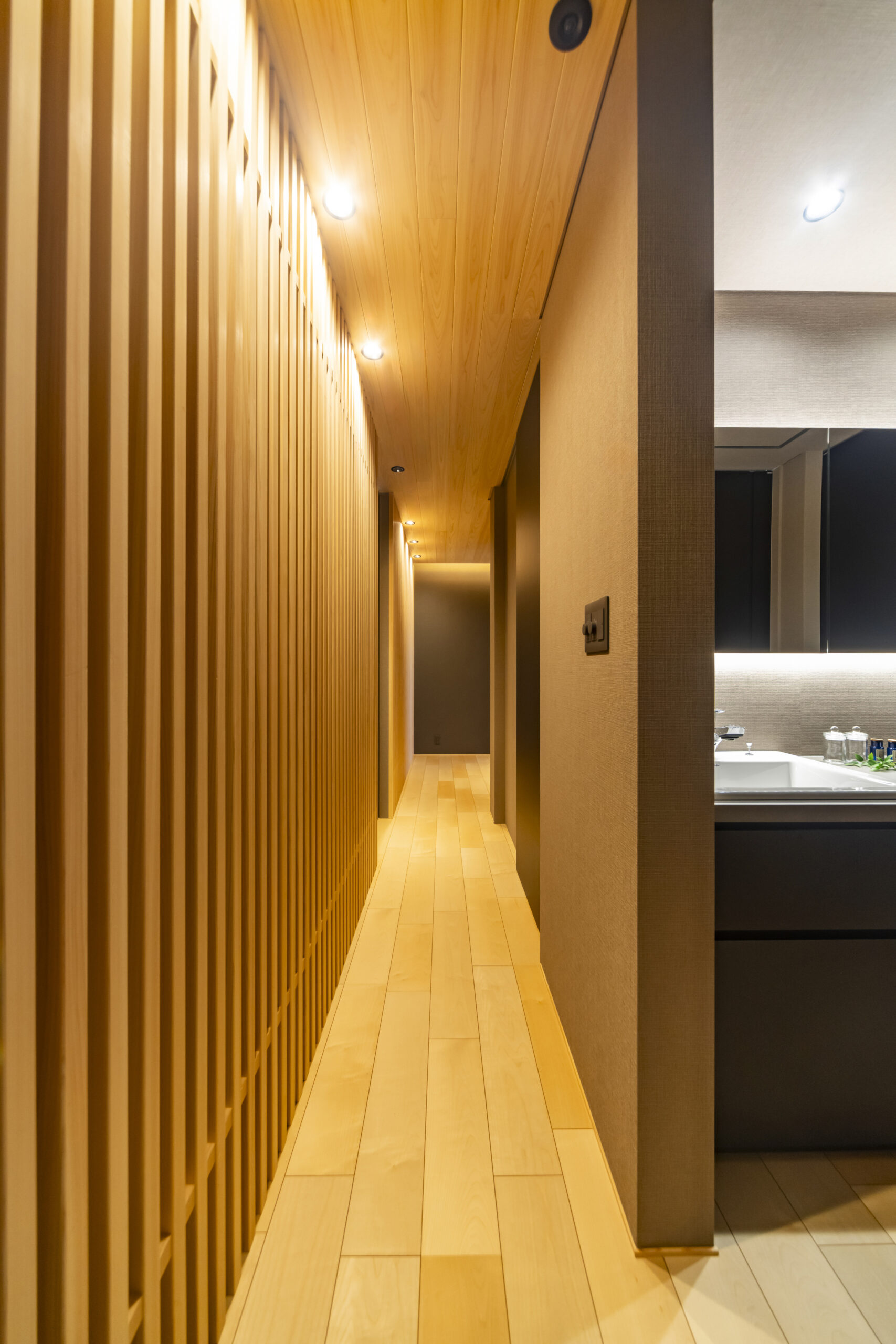玄関から室内へと続く美しい木格子のアプローチ。