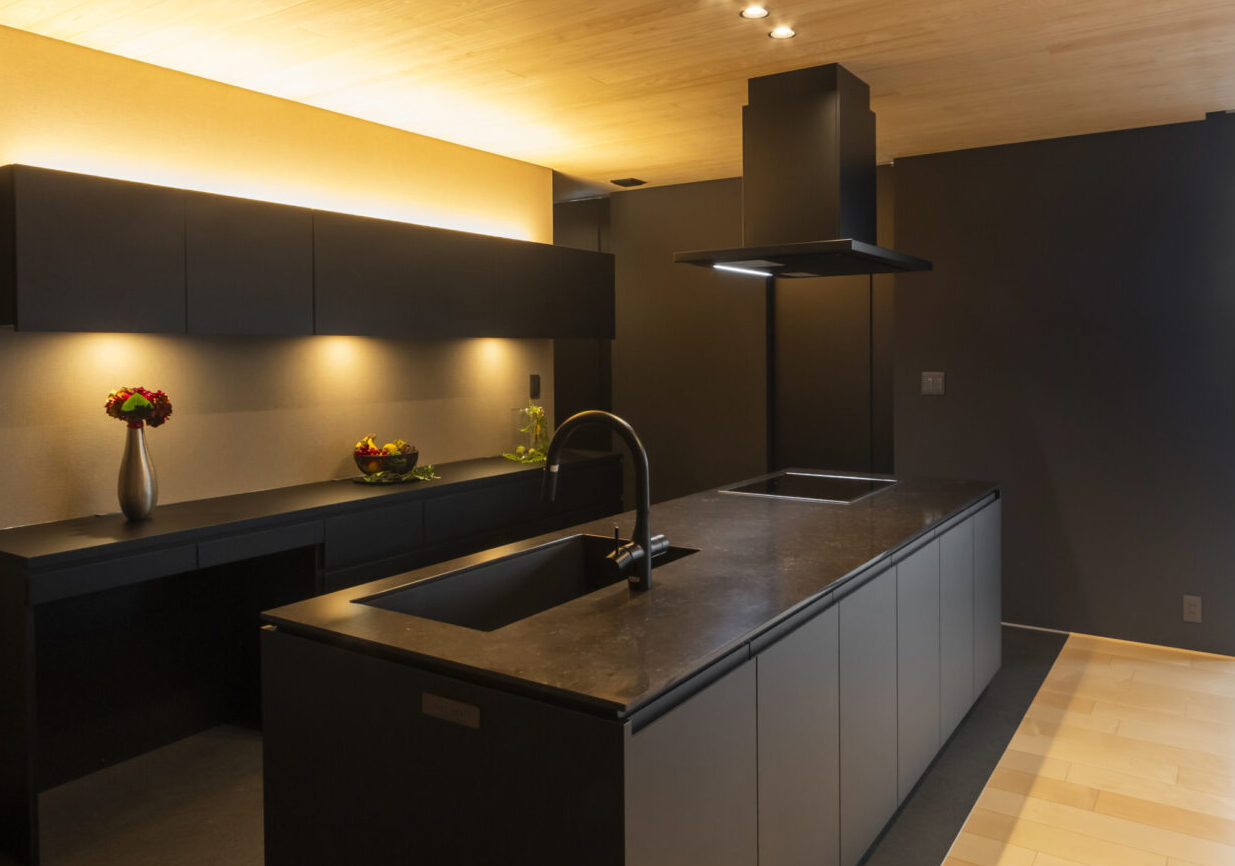 モノトーンで統一されたスタイリッシュなアイランドキッチン。まるでギャラリーのような佇まいに。家族や友人との会話が弾む、上質なダイニングスペースです。