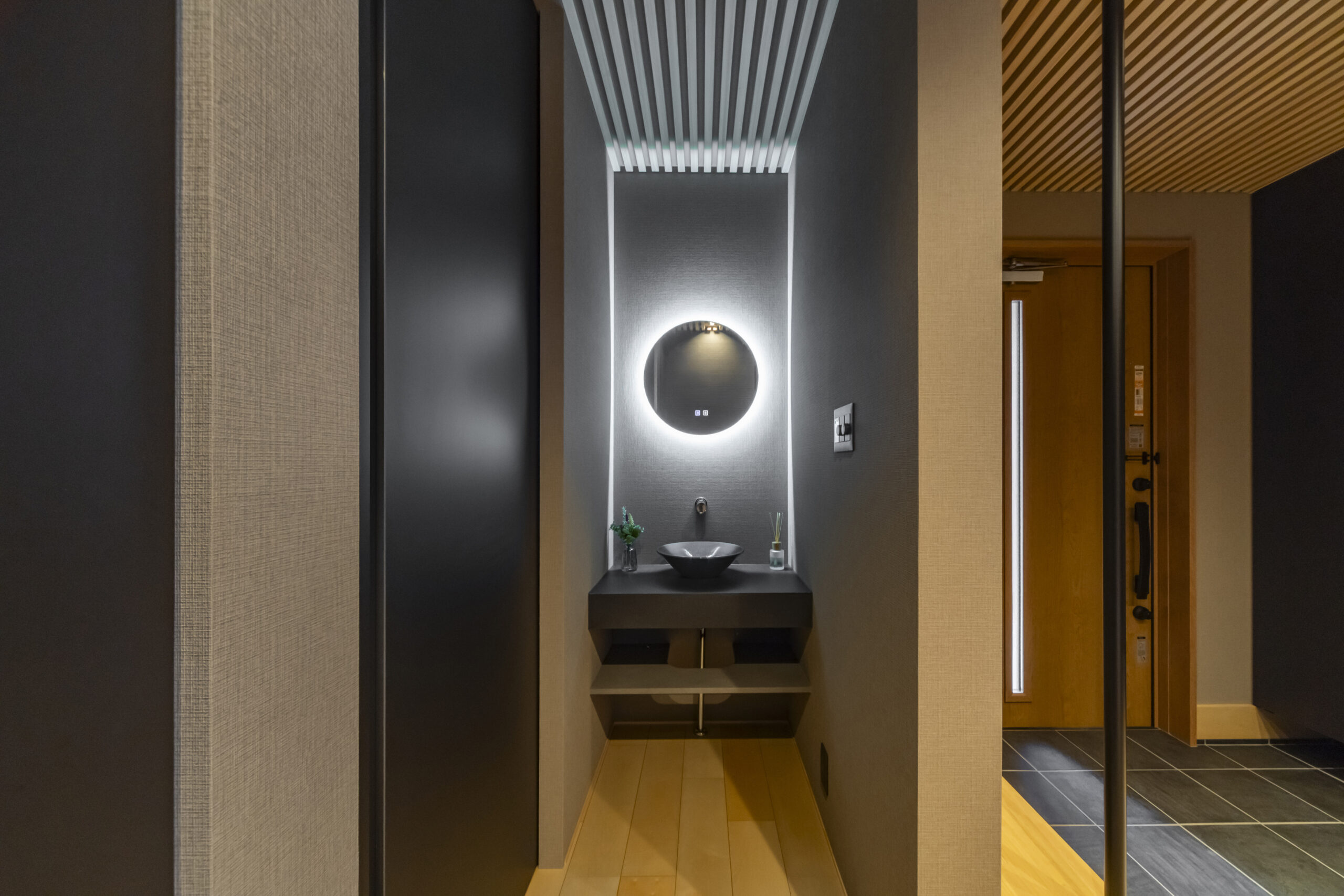 玄関のすぐそばに設えられた洗面は、日々の動作に自然な流れを生み出します。