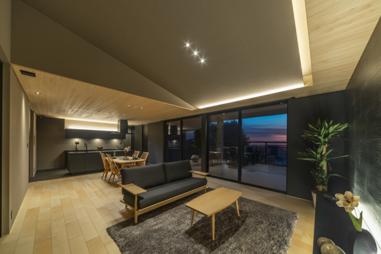 リビングの大きな開口部からは、テラス越しの風景と一体となる開放感を堪能できます。素材、光、そして空間のつながり。すべてにこだわり抜いた、唯一無二の邸宅が完成しました。