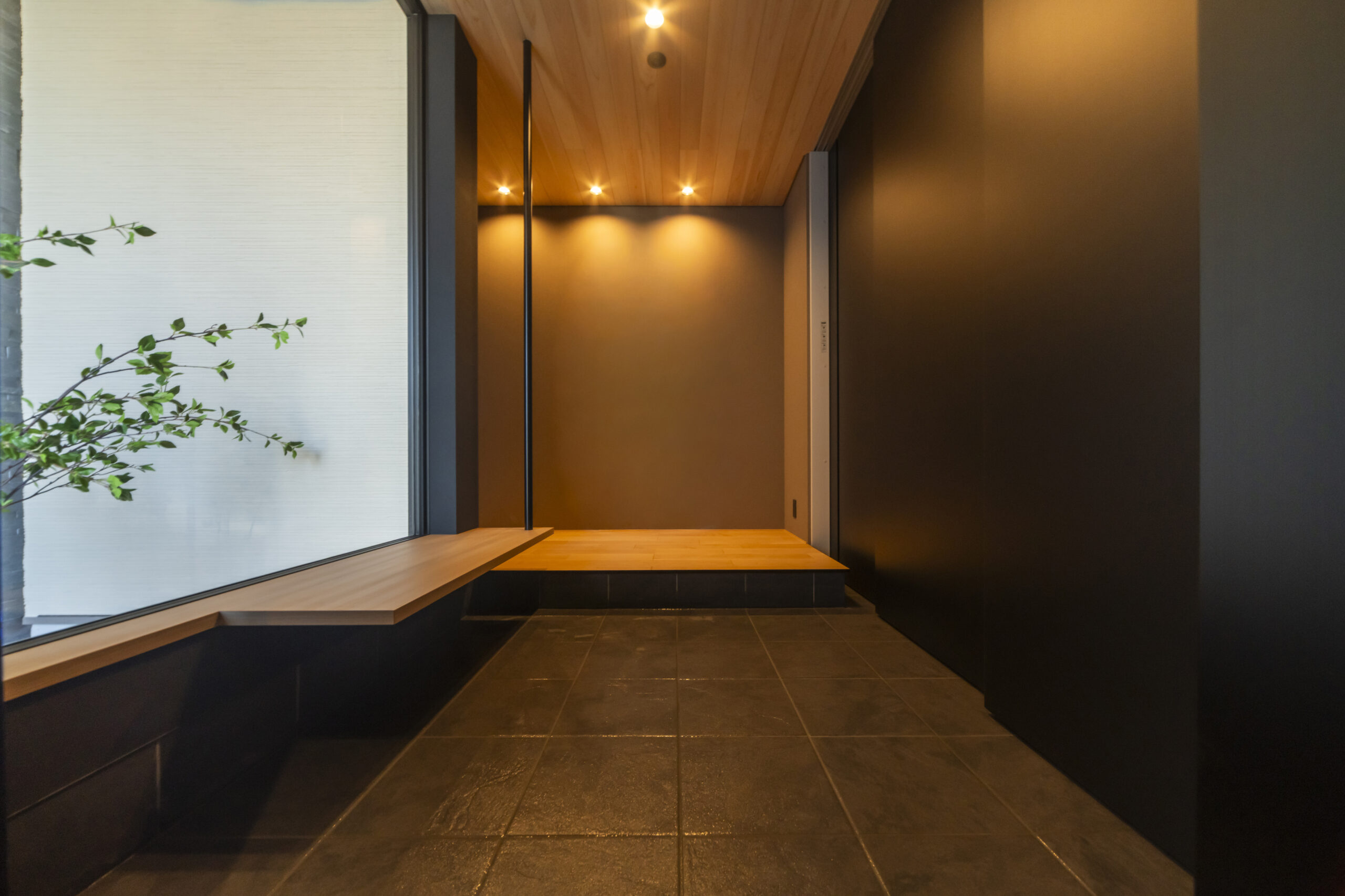 ダークタイルと木の質感が響き合う、静謐なエントランス。大開口の窓からはライトアップされた植栽が絵画のように浮かび上がります。造作ベンチが美しさと利便性を添える、上質なおもてなしの空間です。