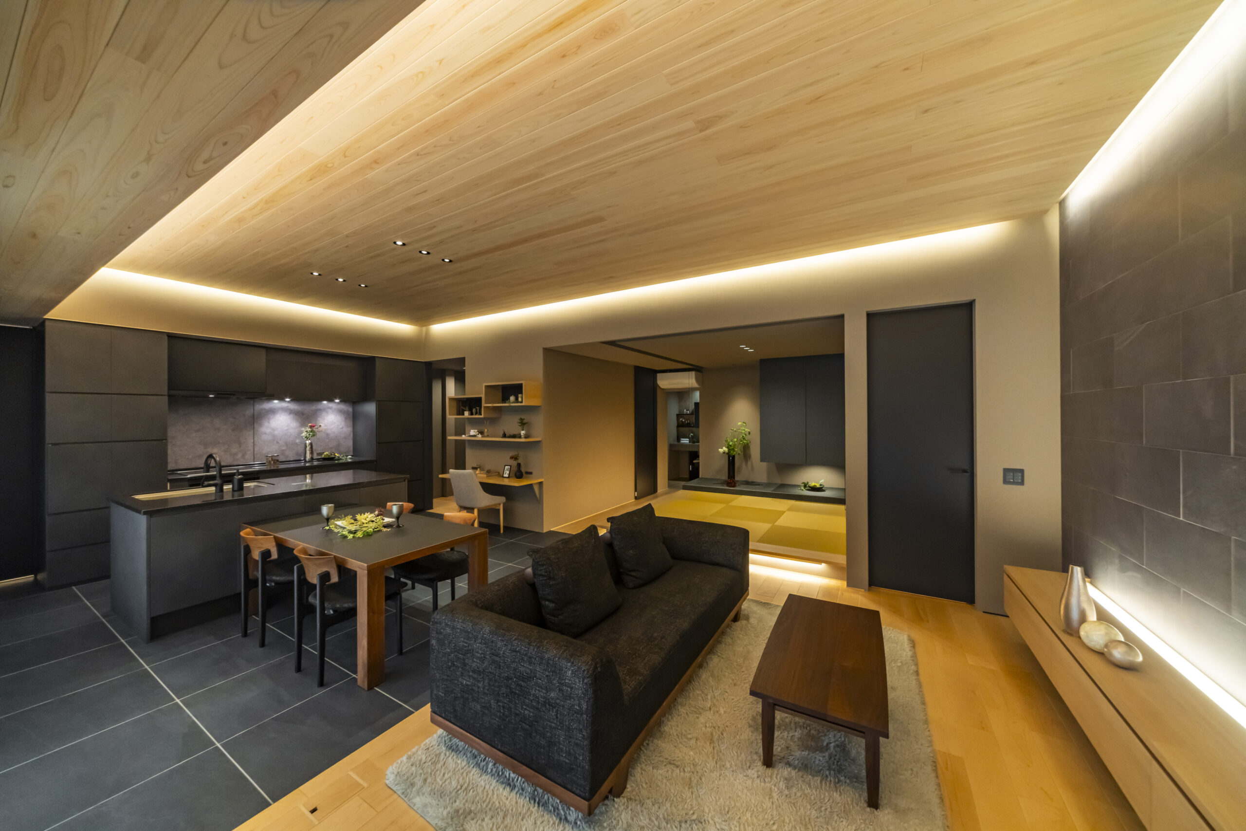 木目天井を縁取る間接照明が、空間に驚くほどの広がりと奥行きを与えます。異素材を巧みに使い分けたゾーニングと計算された配色により、住まい全体がひとつのアートのように調和する、極上の団らん空間を実現しました。