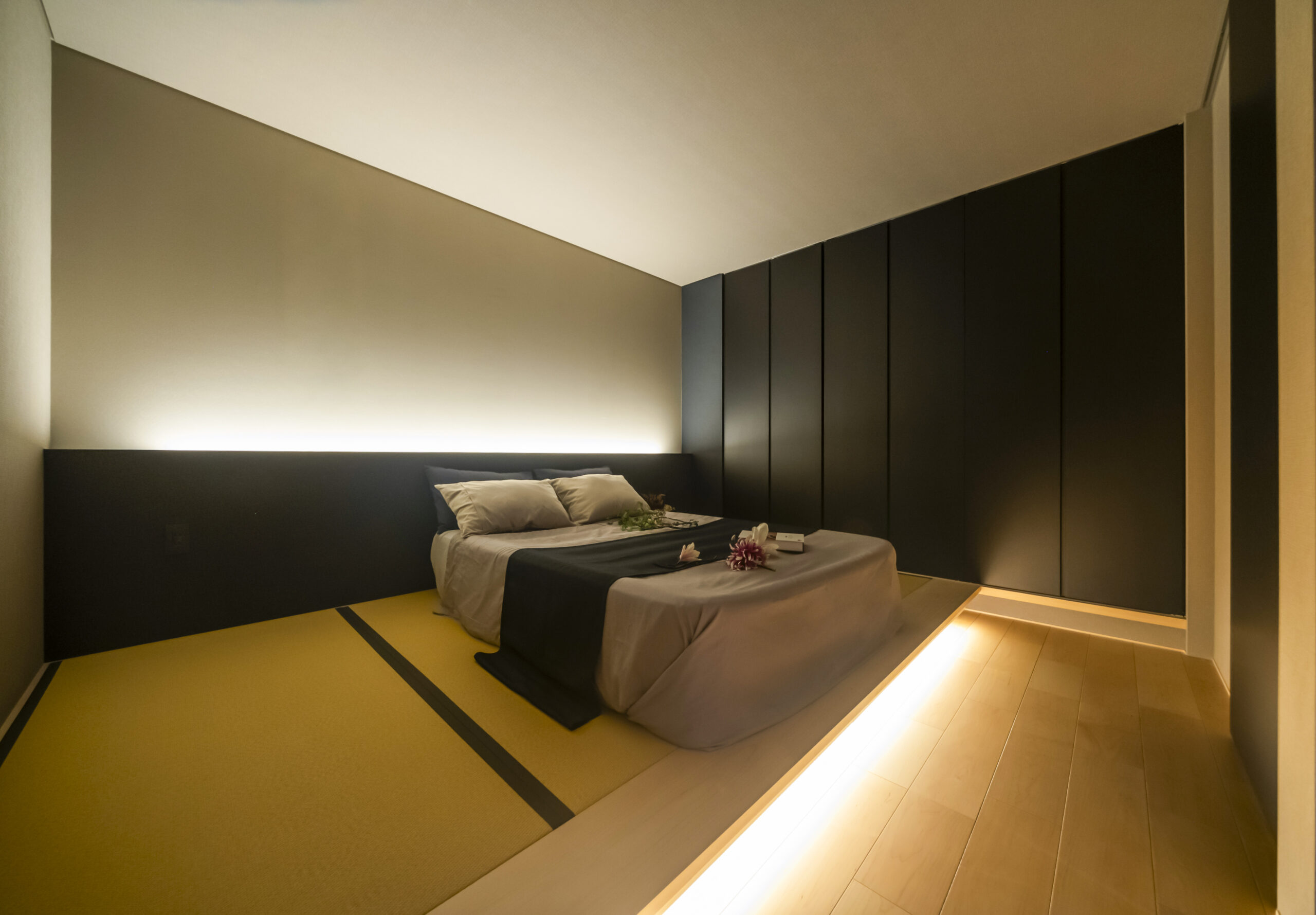 小上がりの畳スペースに間接照明を配し、幻想的な浮遊感を演出。ダークトーンの建具が空間を心地よく引き締め、旅館で過ごすような非日常の安らぎと、心からリラックスできるプライベートな時間をもたらします。