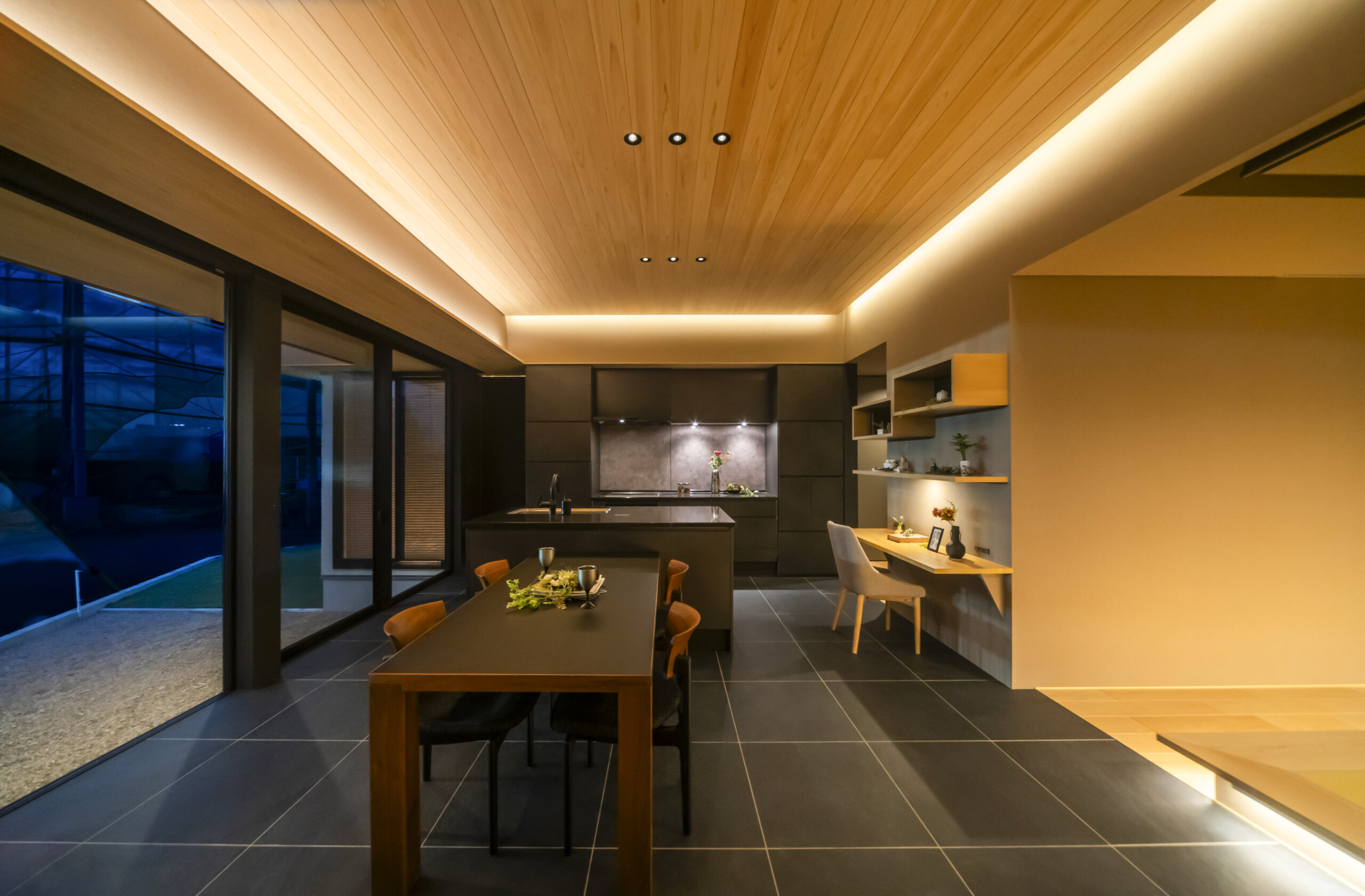 木目天井とグレータイルがスタイリッシュなコントラストを描くダイニング。生活感を感じさせないアイランドキッチンや、多目的に使えるワークスペースを備え、日常を優雅に彩る洗練された空間を創出しました。