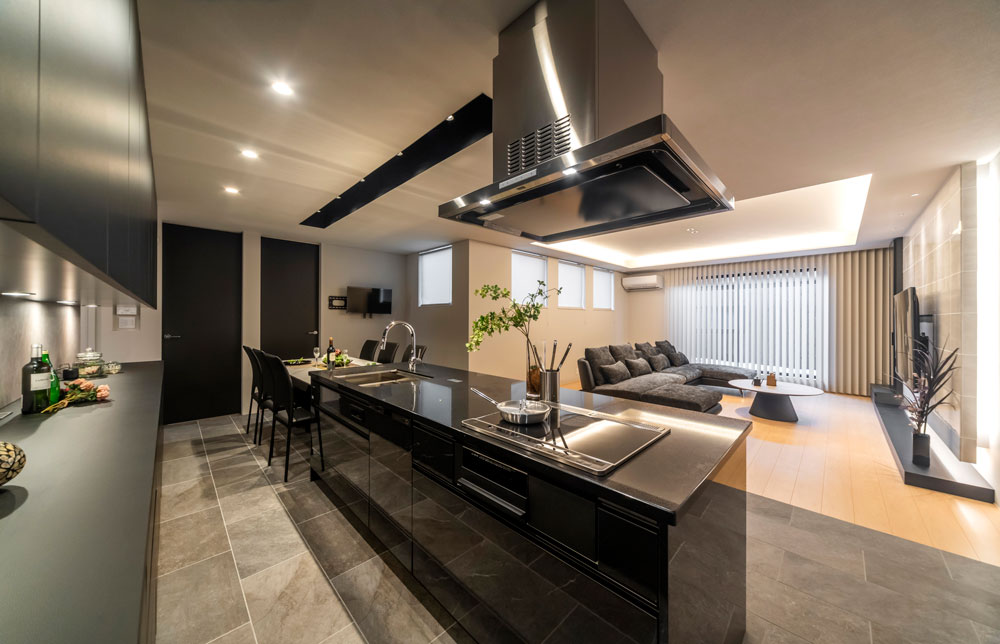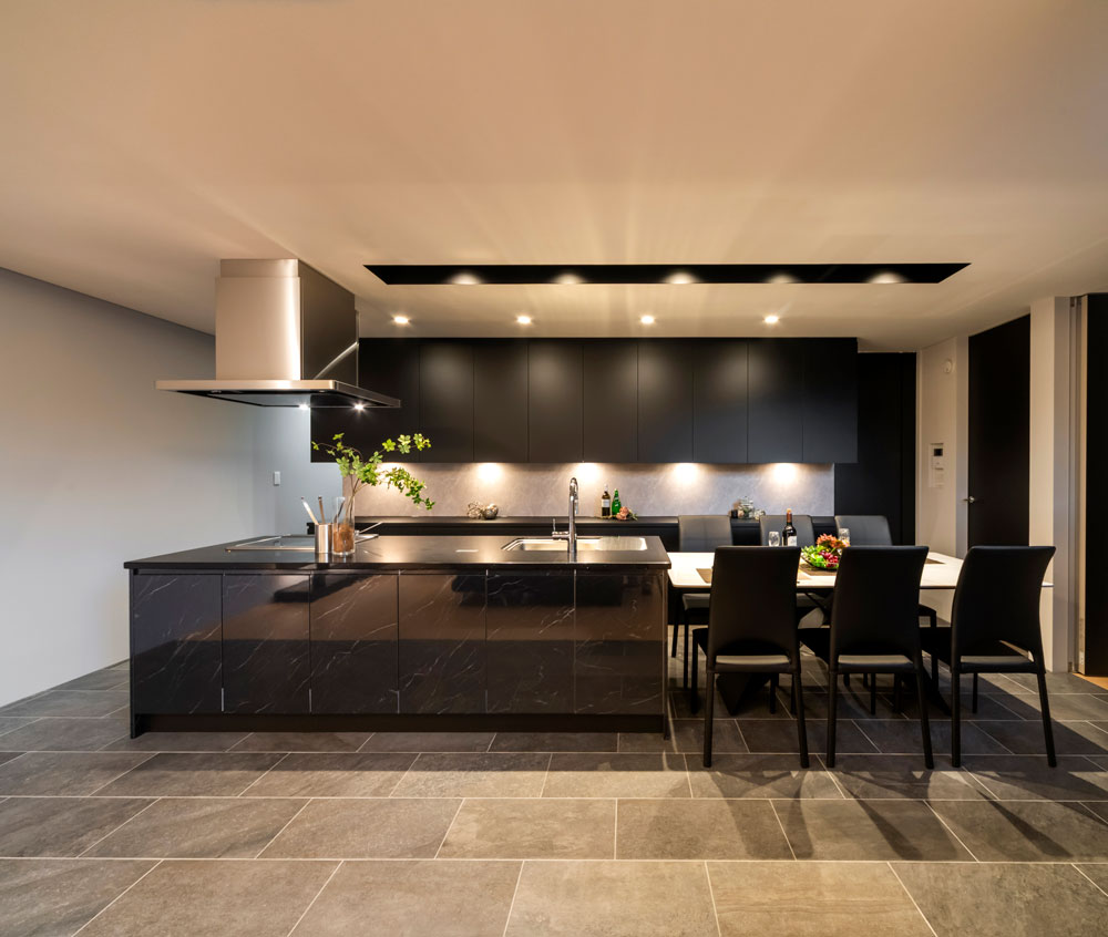 モダンに引き締める黒で統一されたアイランド型 。一体感のあるデザインで生活感を抑えつつ、必要な収納力を確保。