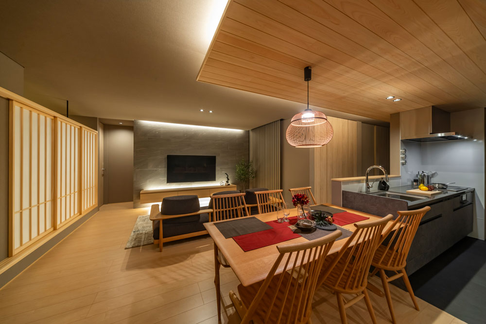 天井の板張りと間接照明が、時間の移ろいと共に表情を変える陰影を創出。