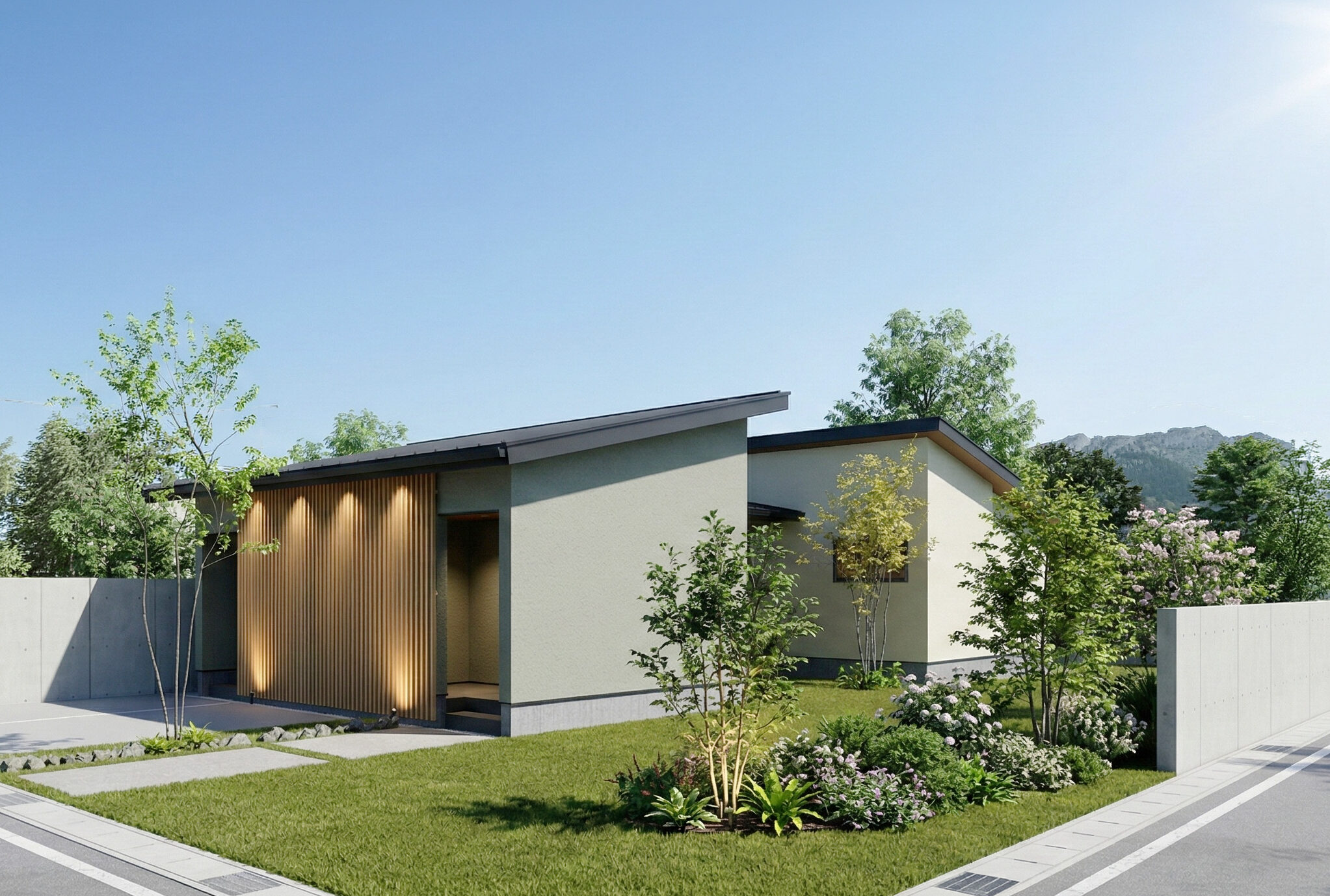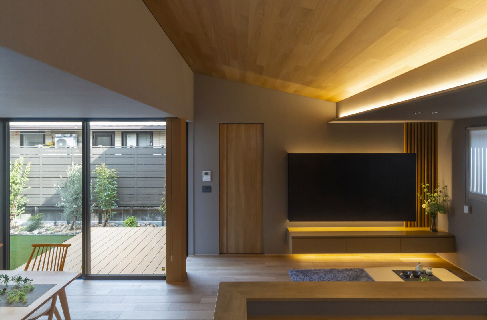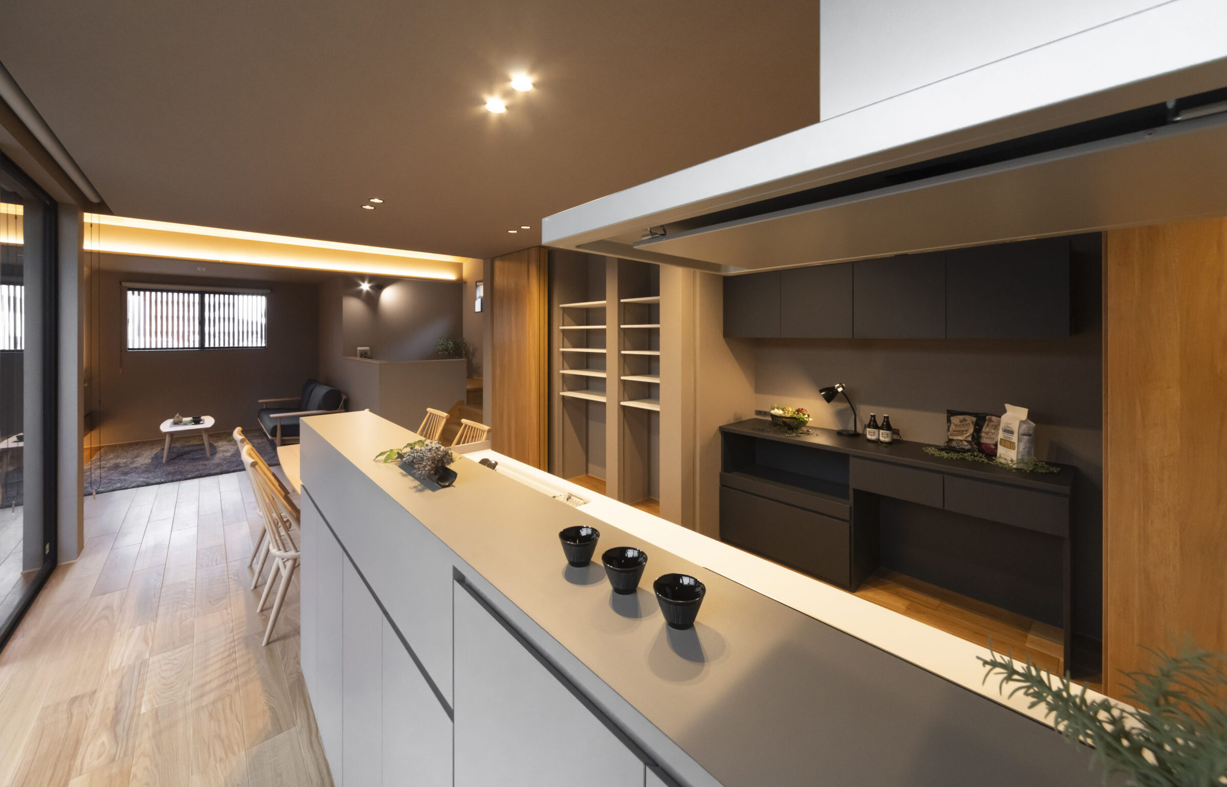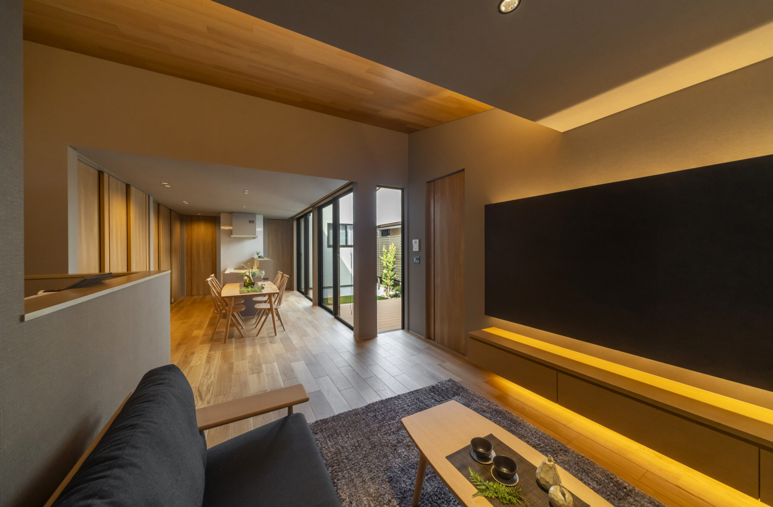 勾配天井がより一層広がりを生む21帖のLDK。和モダンな設えとライティングで落ち着きを演出。 柔らかな光が、疲れた心身を優しく鎮めます。