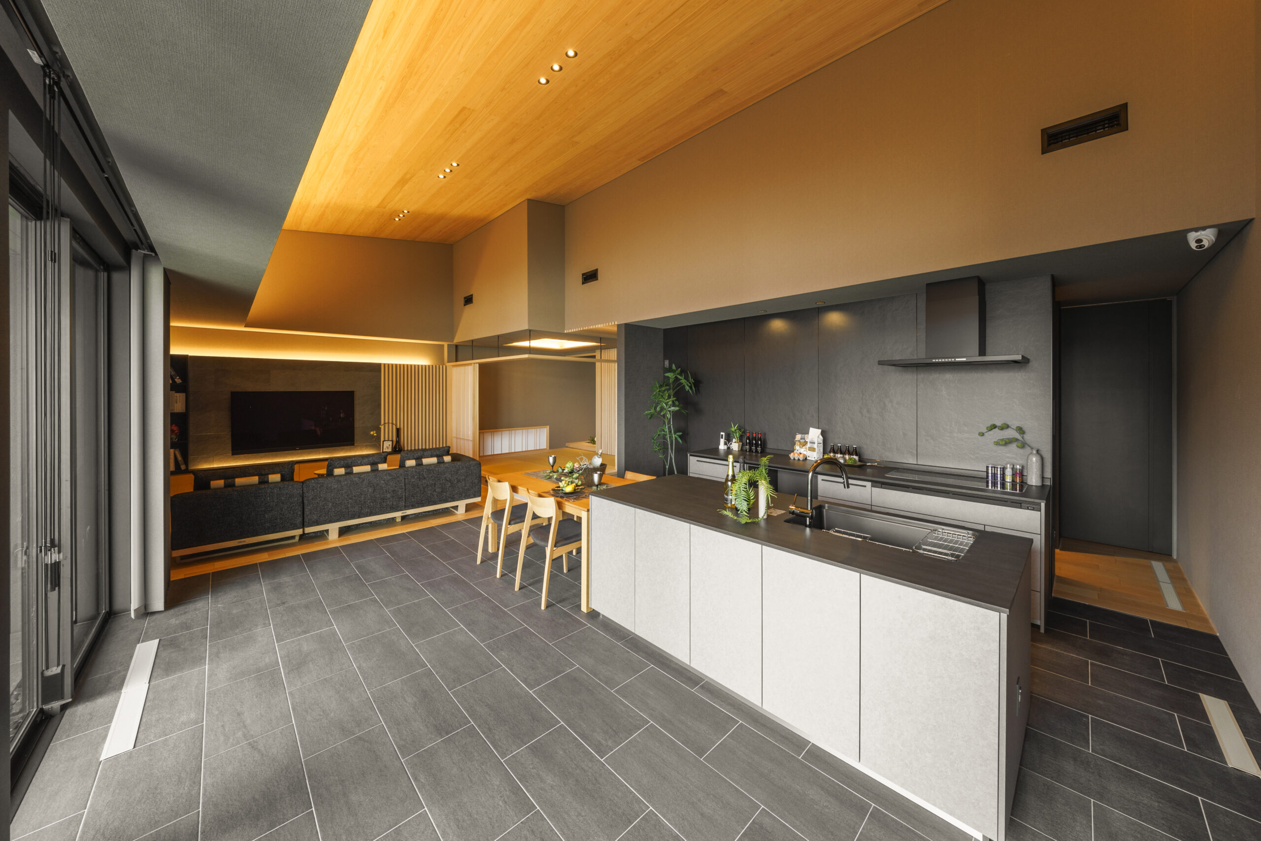 高さと素材を変えた高天井が、平屋とは思えないほどの圧倒的な開放感を創出。光が注ぐリビングにはTVステーションを配置し、建物の雰囲気を一層引き立てながら、家族の時間を豊かに彩ります。
