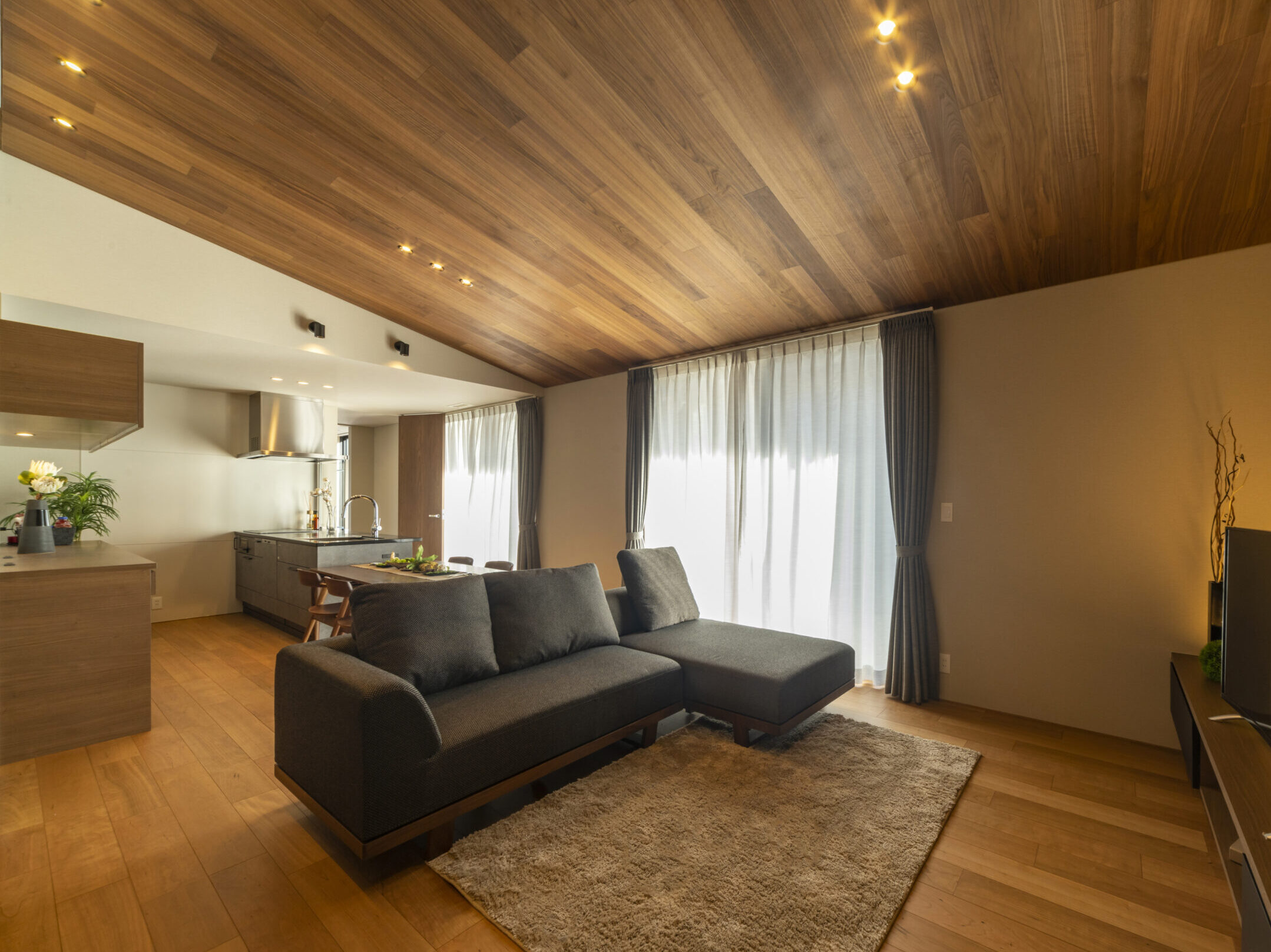 勾配天井がより一層広がりを生む21帖のLDK。収納や冷蔵庫をすっきり隠し、自然と片付いた印象に。