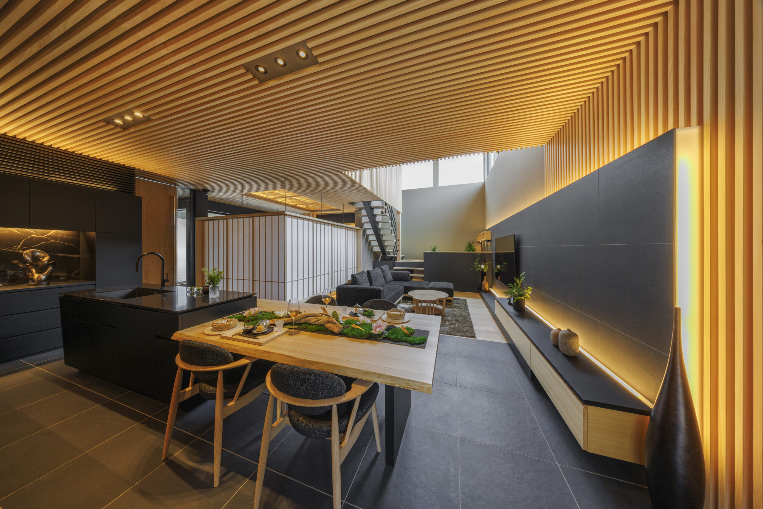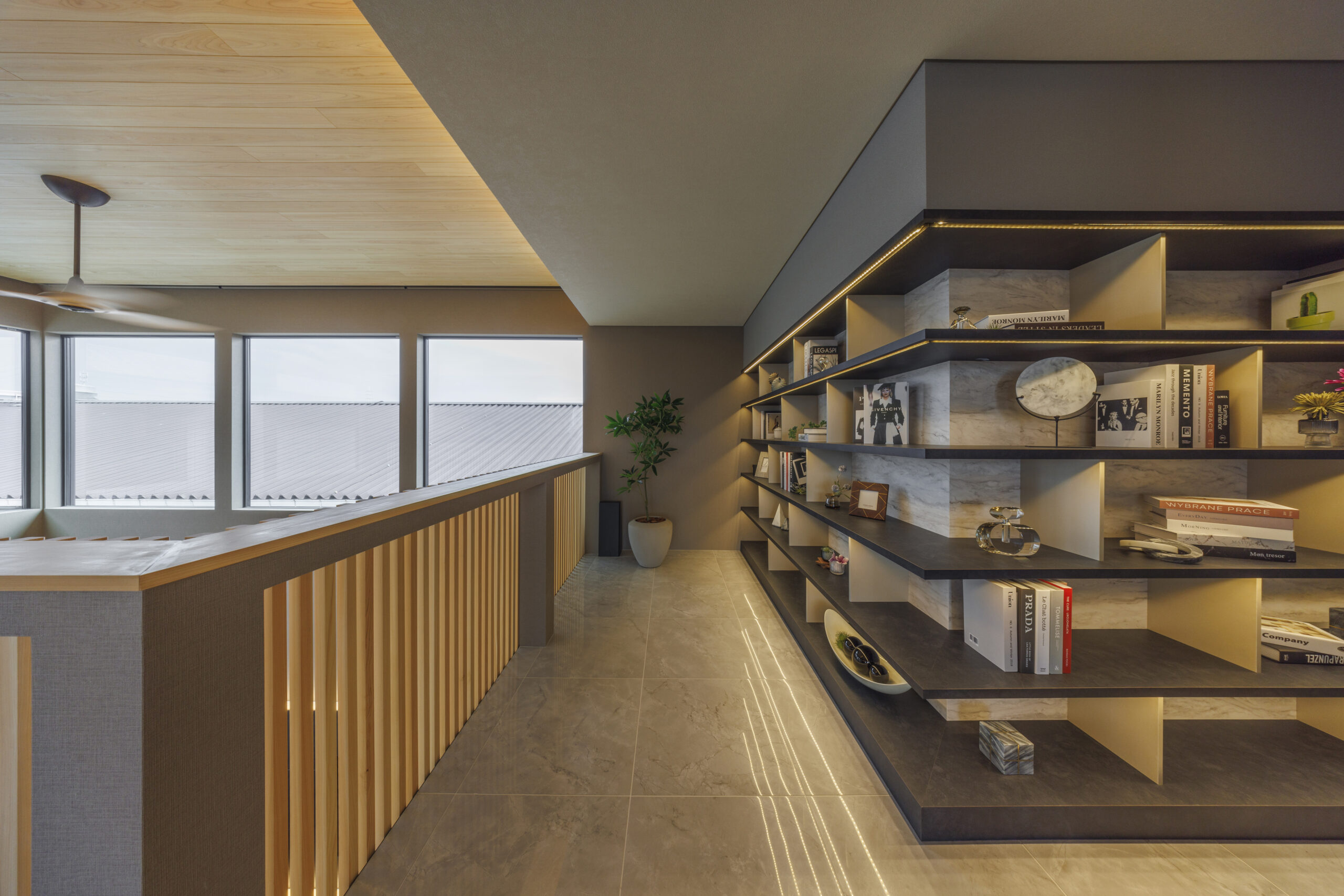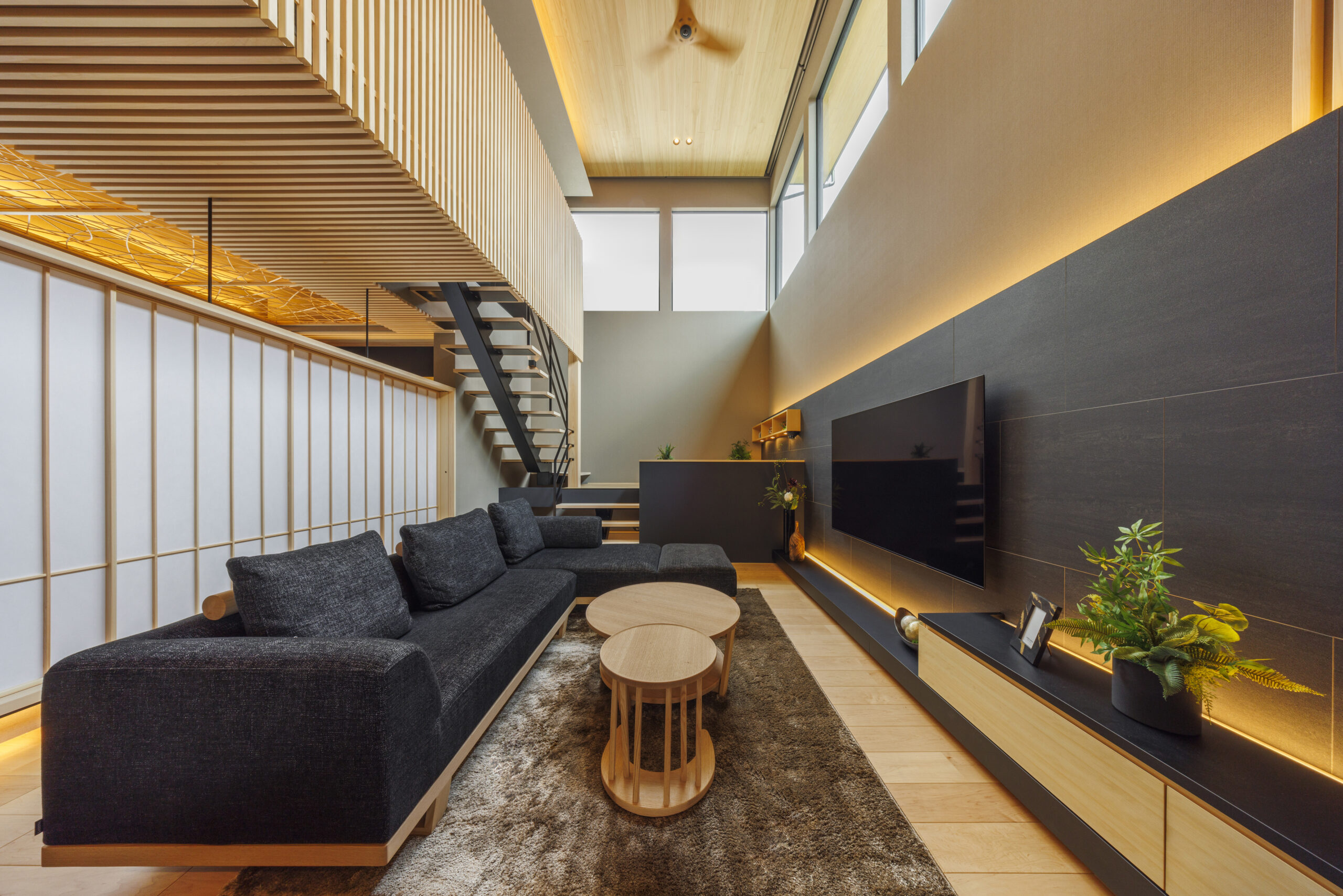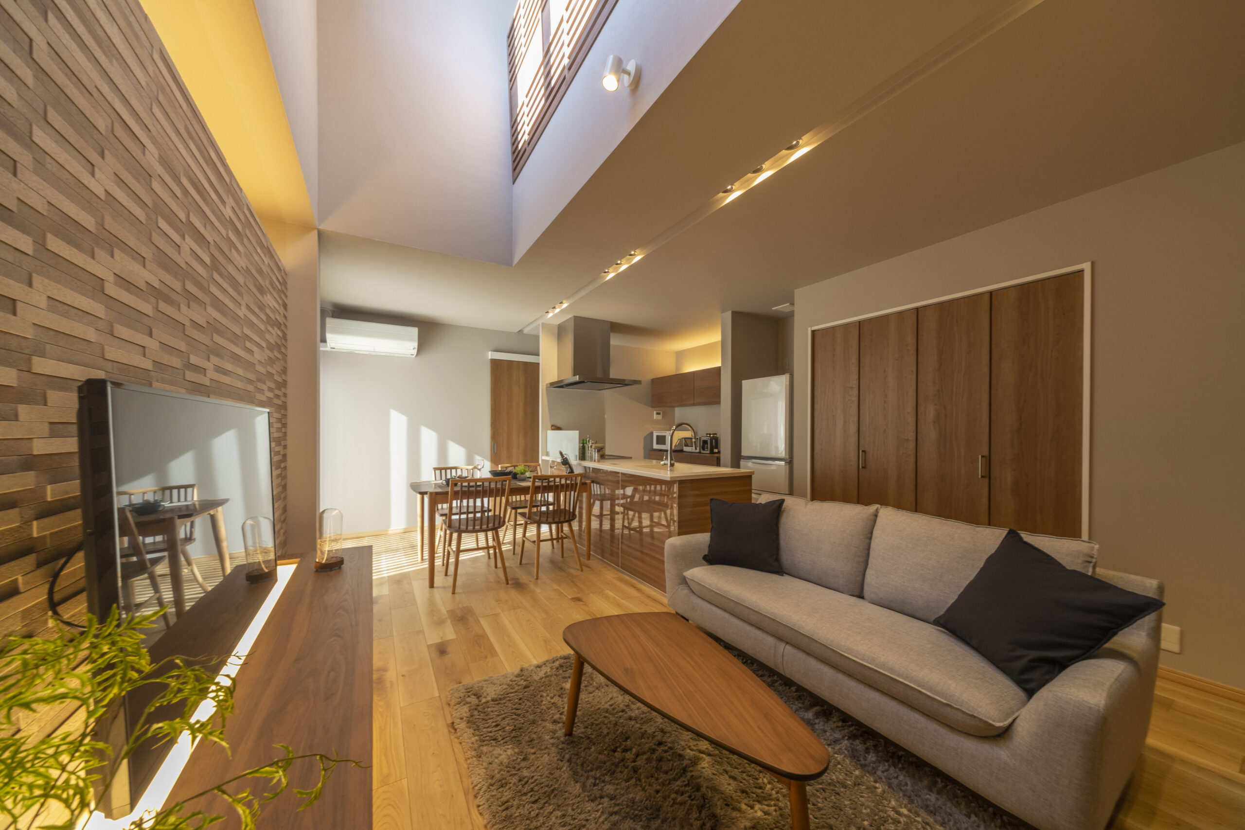 縦に広がる吹き抜けからは光が注ぎ込み、家族が自然と集まる明るく心地よい空間が広がります。