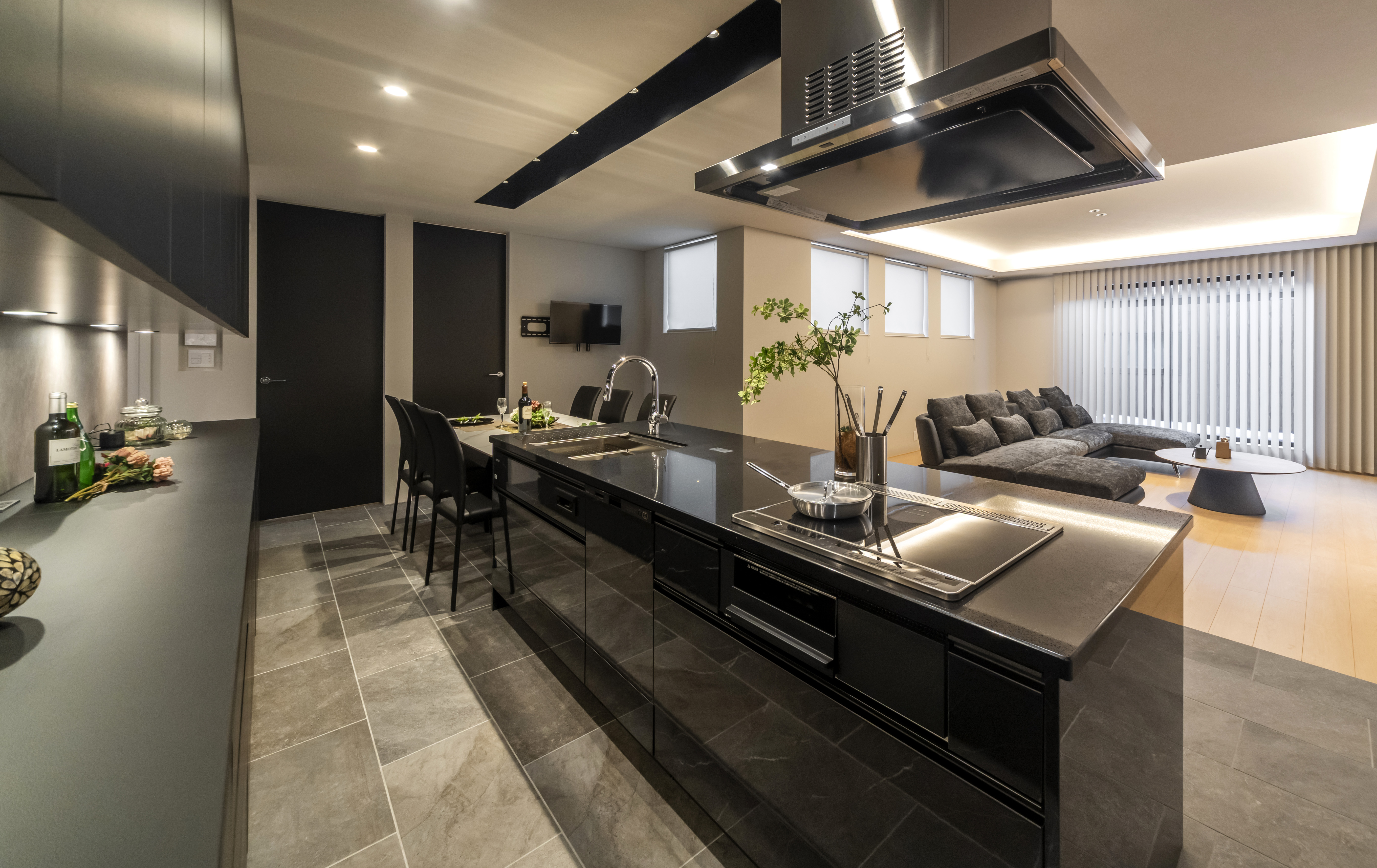 モダンに引き締める黒で統一されたアイランド型 。一体感のあるデザインで生活感を抑えつつ、必要な収納力を確保。