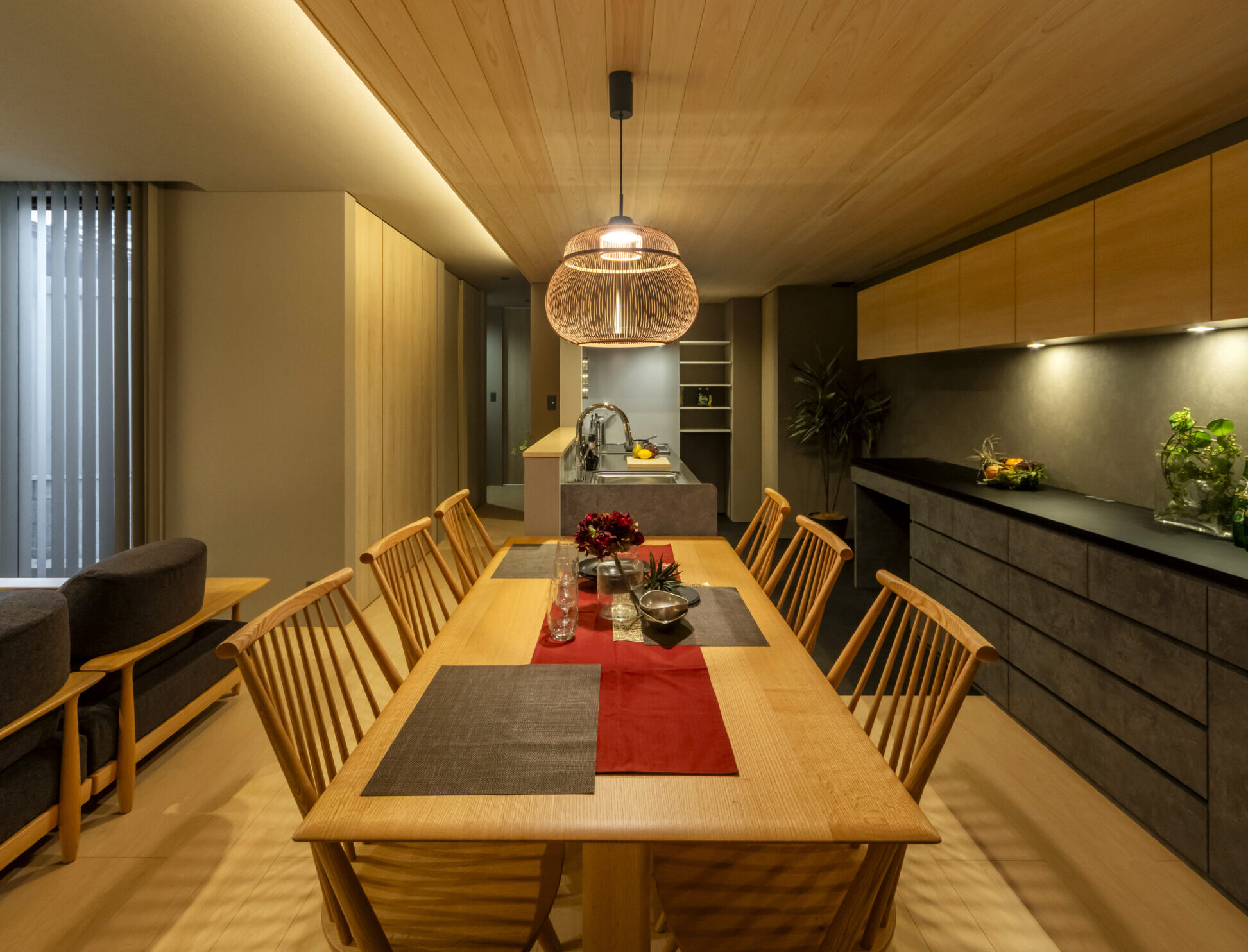 天井の板張りと間接照明が、時間の移ろいと共に表情を変える陰影を創出。一つ一つの意匠が、開放的な21帖のLDKを、より上質にします。