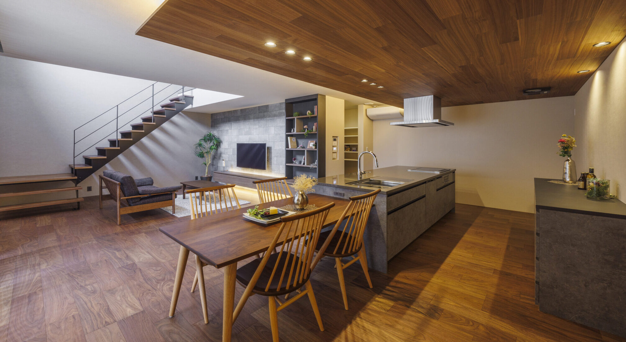 キッチンの天井はあえて少し低くし、温かみのある板張りに。仕込まれた間接照明で、夜はしっとり落ち着いた大人の空間に変わります。