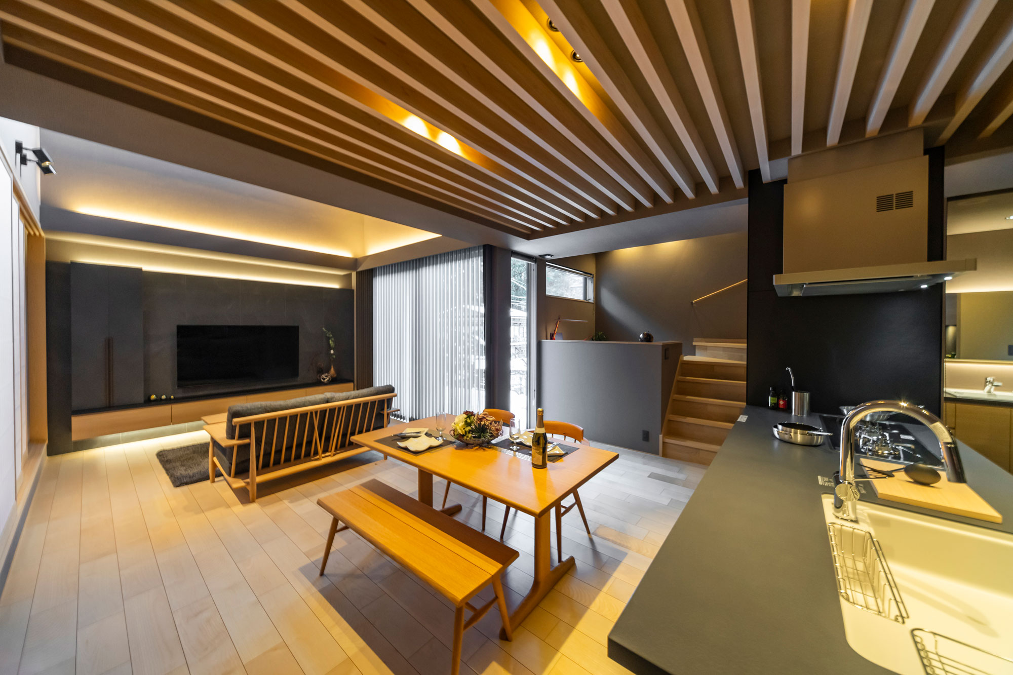 上質な木格子が描く陰影と、吹き抜けリビングの開放感。