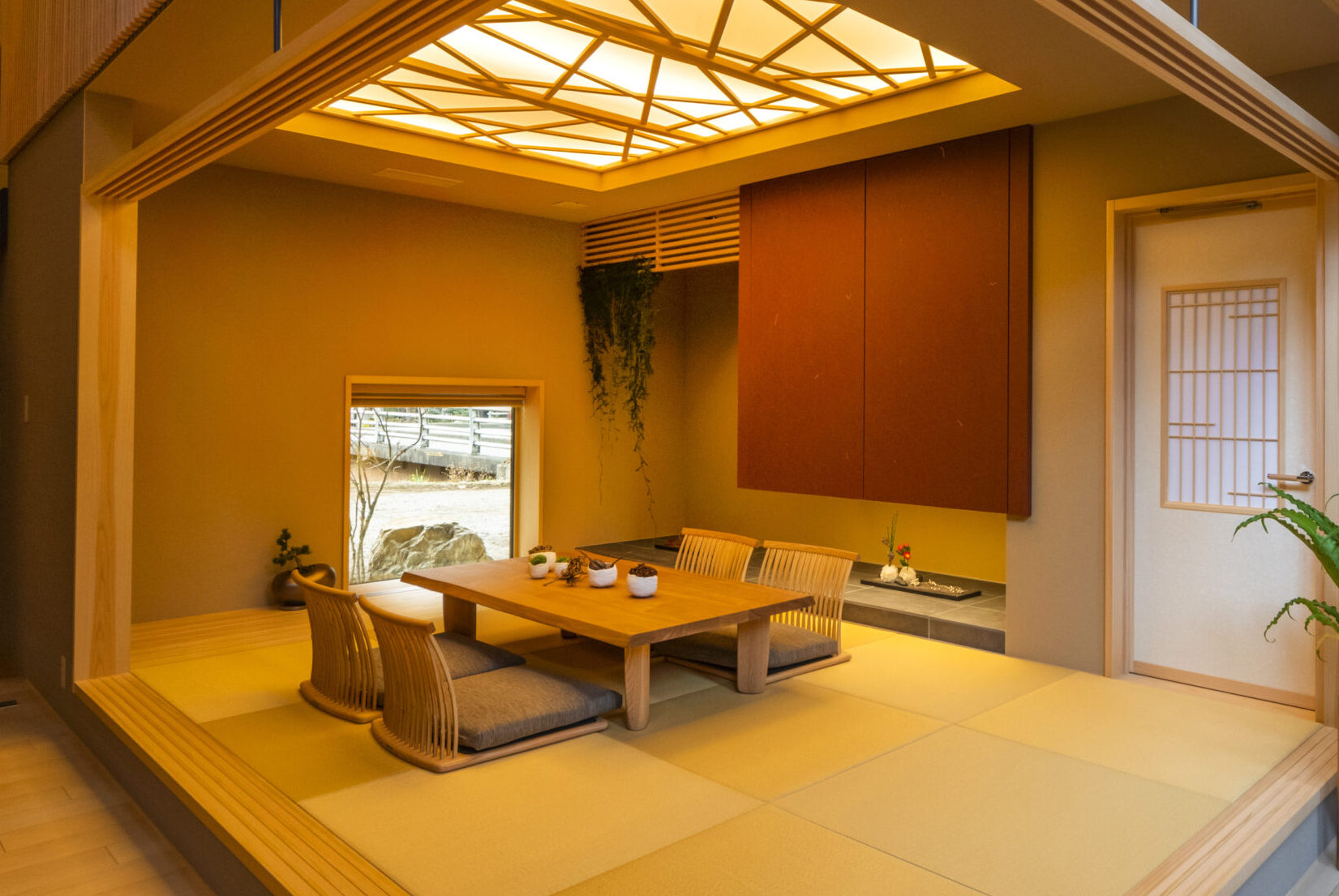 障子越しの柔らかな光と、木の温もりに包まれる癒やしの空間。寒い冬の日、暖かいお茶と共に家族で団欒したり、ゲストをおもてなししたりと、心安らぐひとときを演出します。